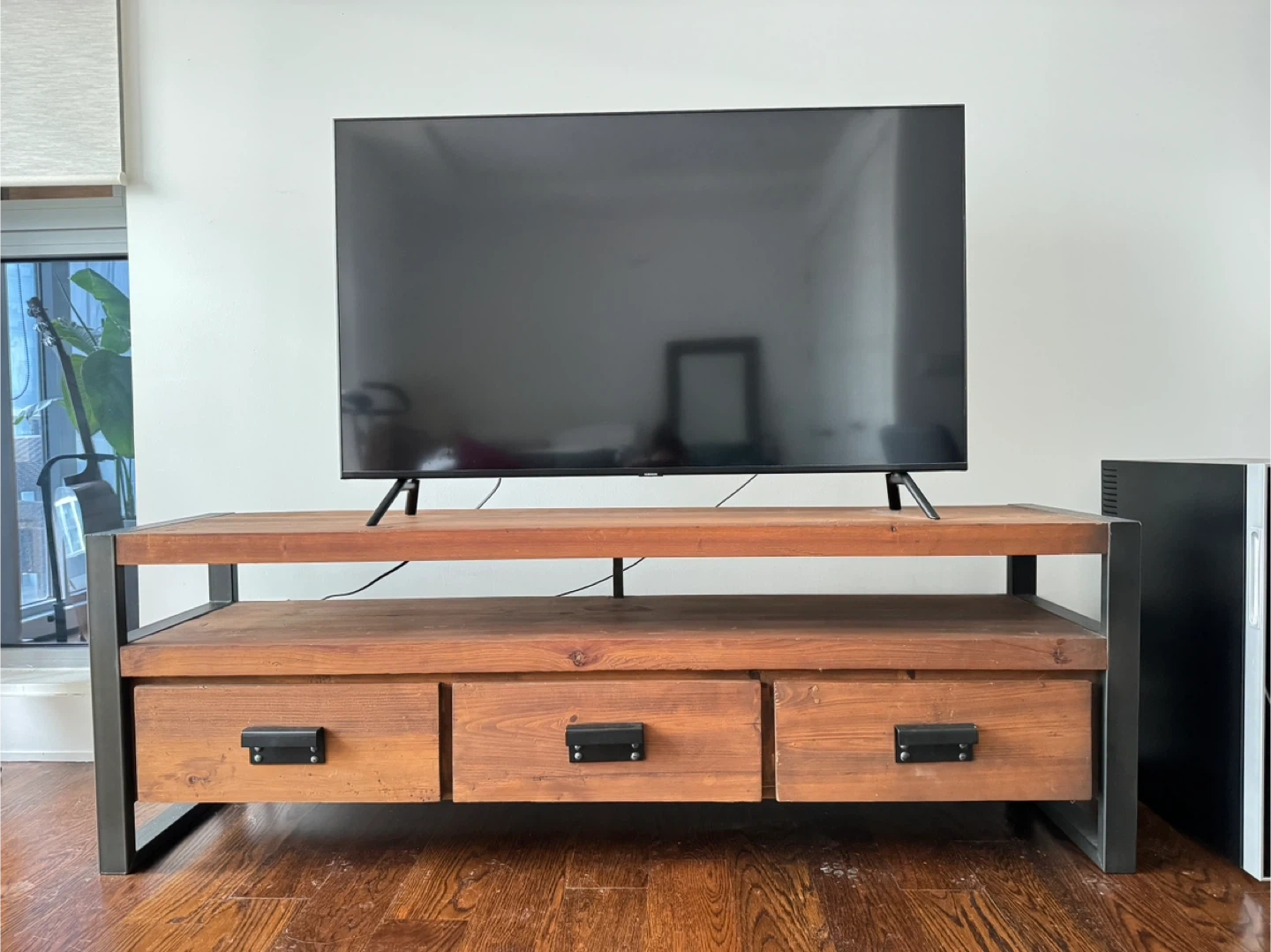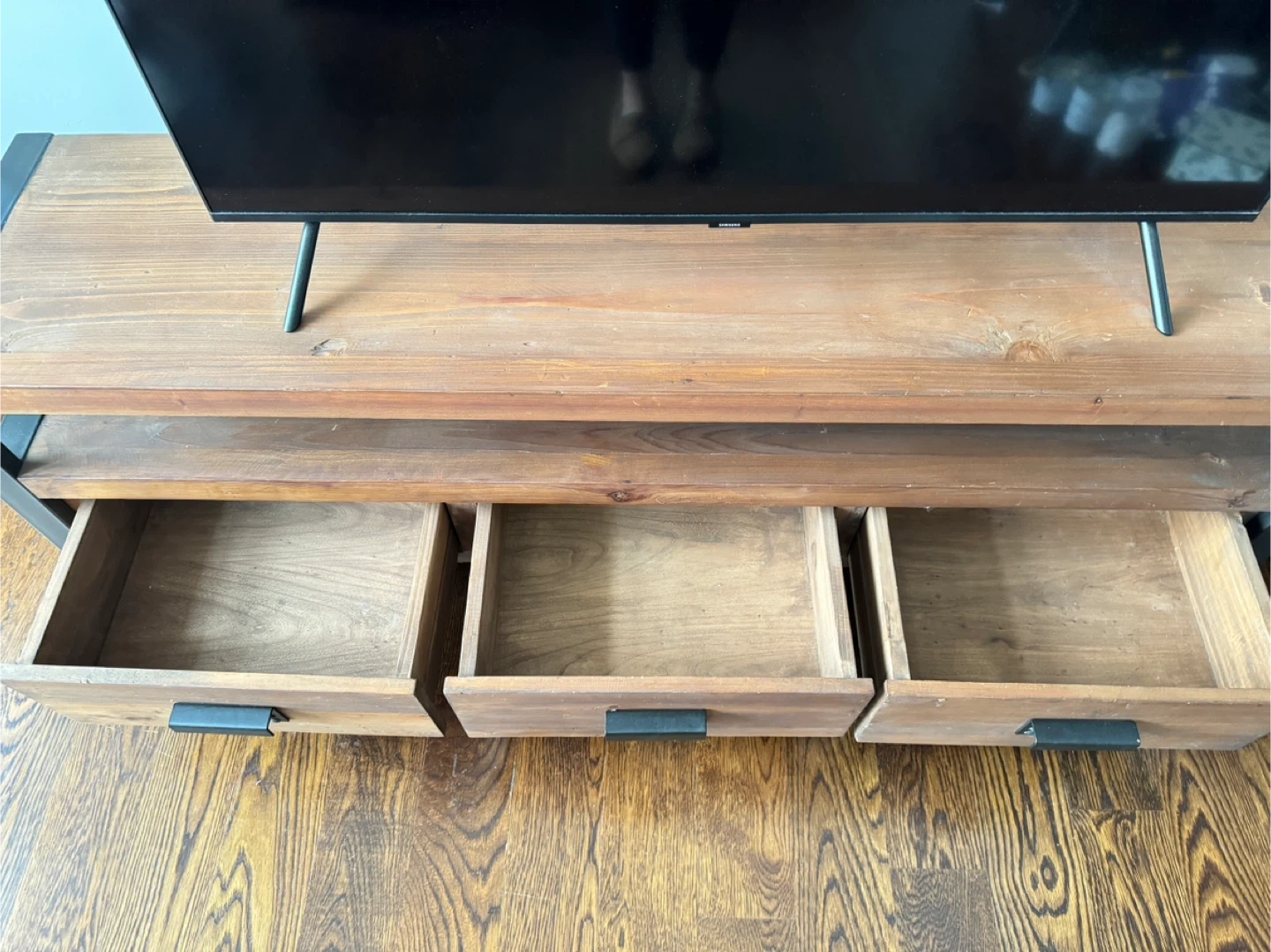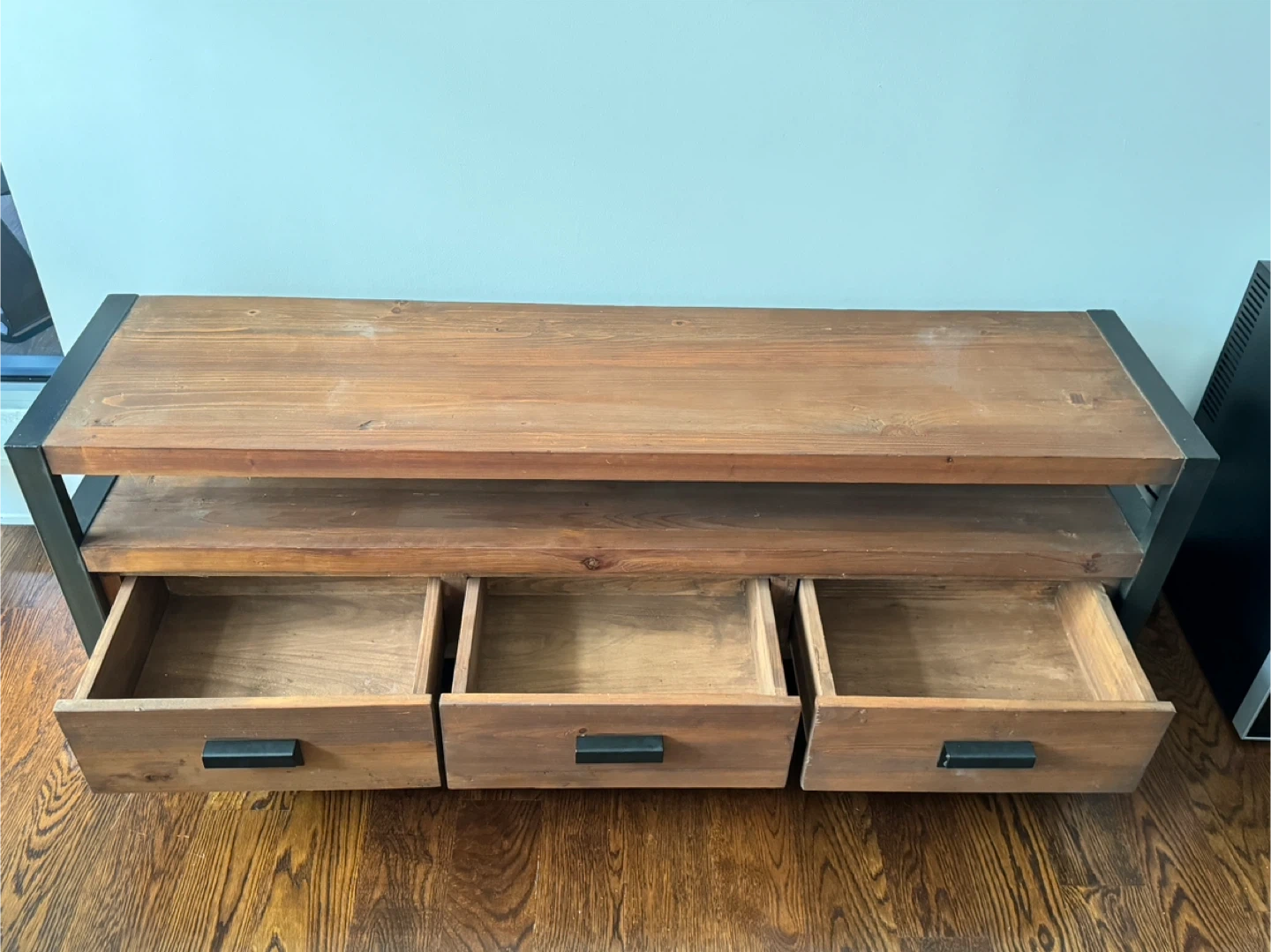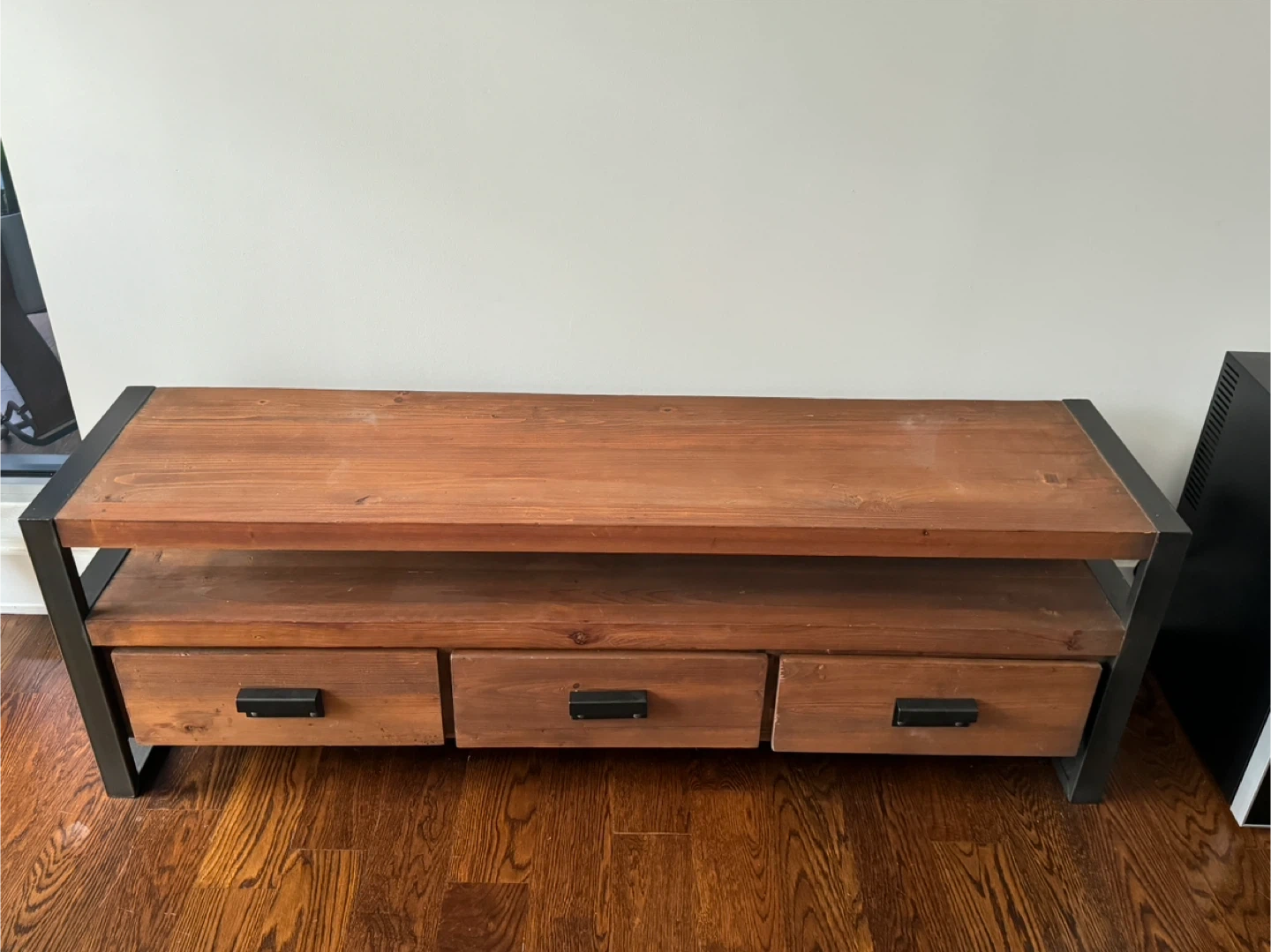West Elm Rustic wooden TV stand with a metal frame. It features three spacious drawers for storage. This stand has a modern industrial design. Great condition!