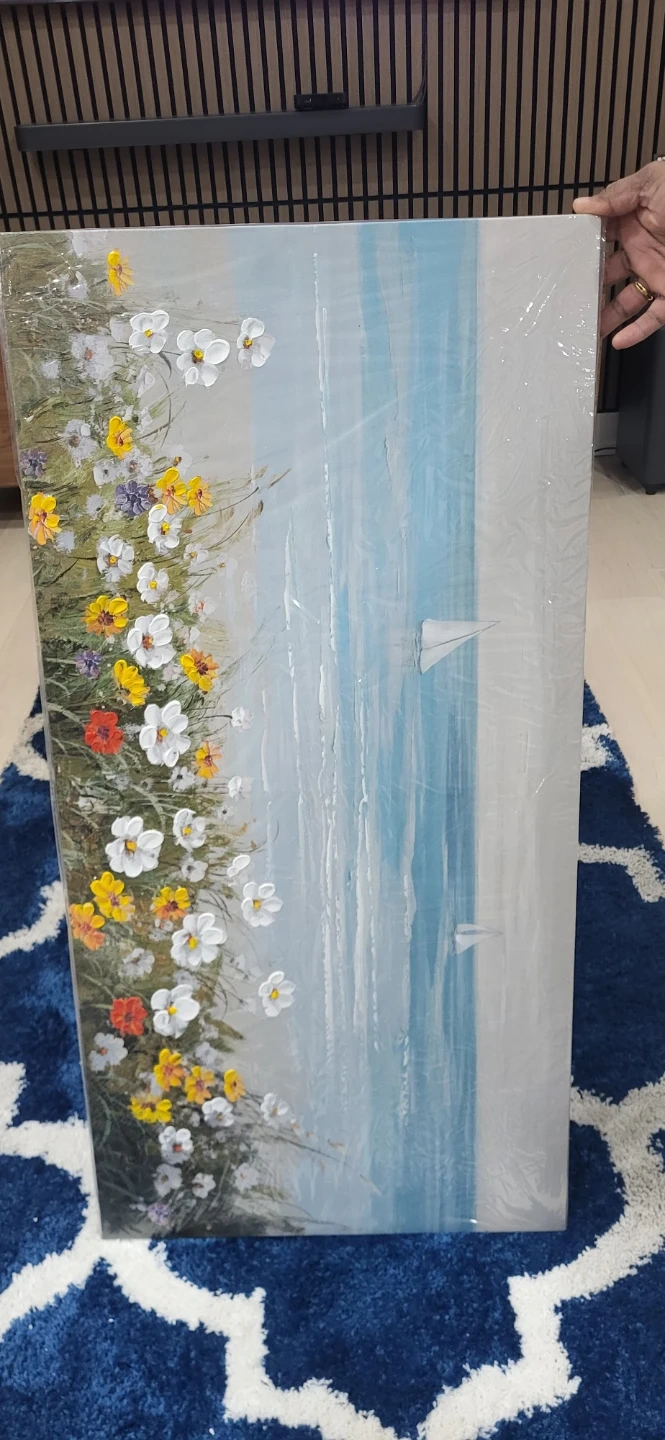 This beautiful canvas wall art features a vibrant floral arrangement on the left with a serene seascape on the right. It's framed and ready to hang. Enjoy art and enjoy life!40*60