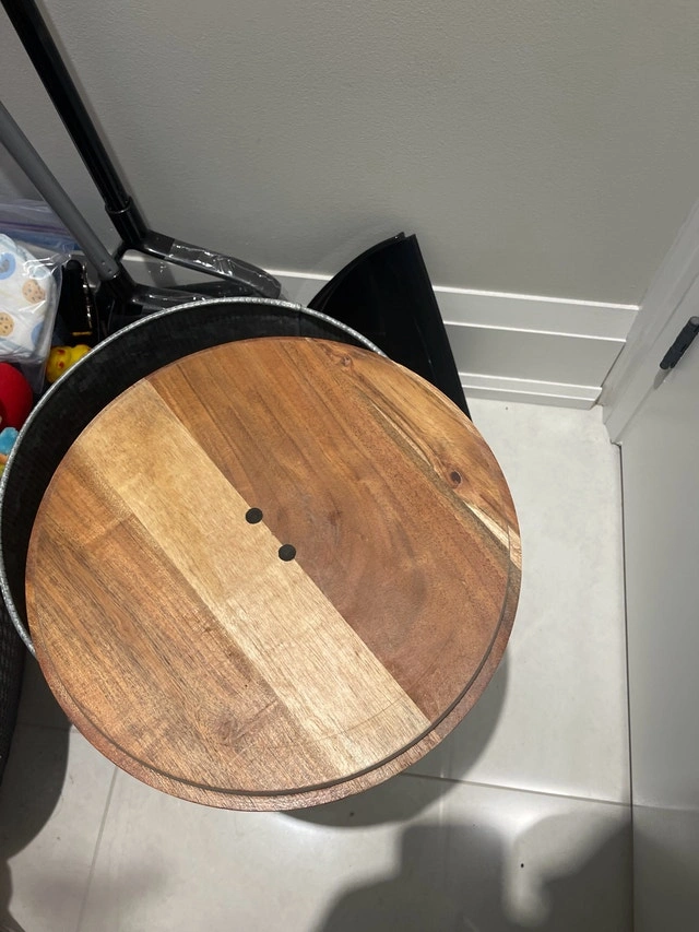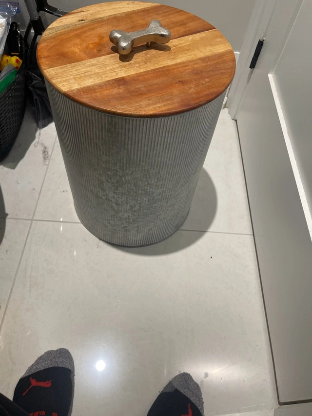 Gorgeous metal and wood pet food storage container in excellent condition. The body is made from metal, not plastic, so it won’t contaminate your pet's food. The lid is made of wood and sits securely, sealing out air and moisture. The handle on top is metal, possibly brass, in the shape of a bone. We no longer need it as we switched our pet to a raw food diet. Available immediately. Curbside pickup available.