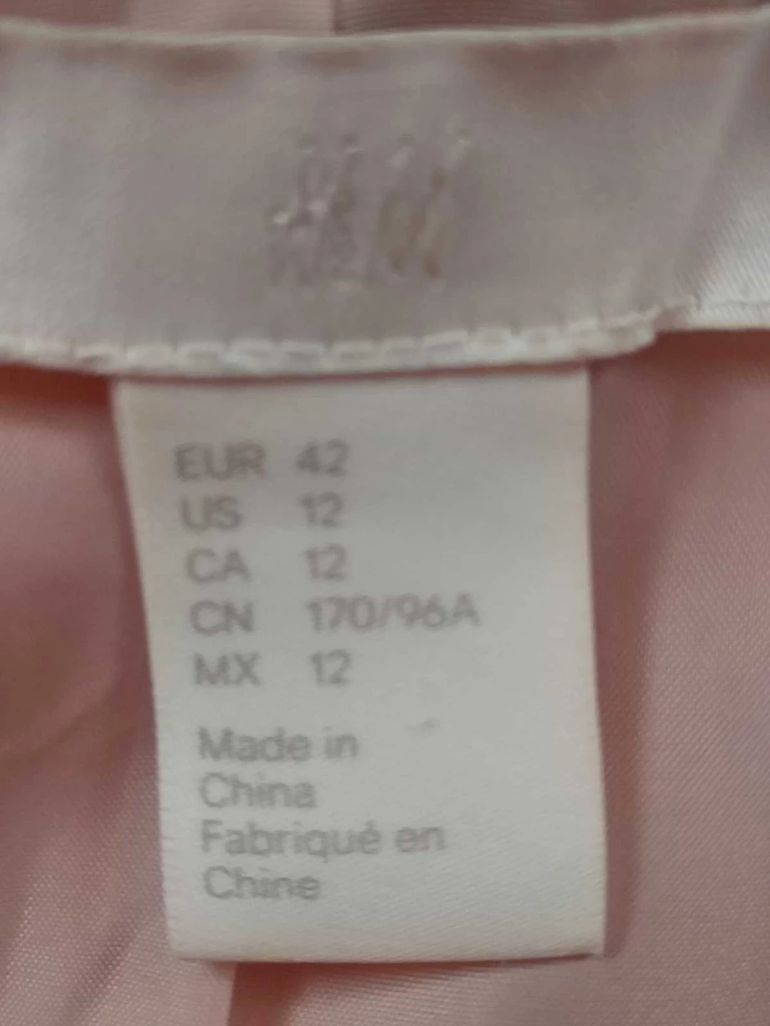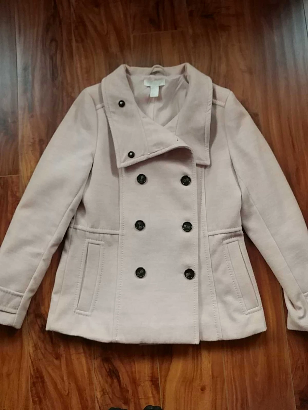 This H&M pea coat is a lovely light pink colour. It's a double-breasted style with button closure. The size is US 12, but fits on the smaller side. Excellent condition.