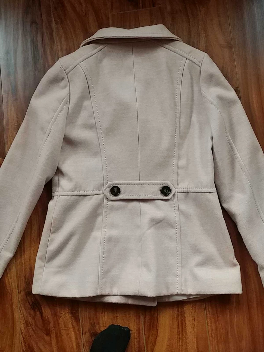 This H&M pea coat is a lovely light pink colour. It's a double-breasted style with button closure. The size is US 12, but fits on the smaller side. Excellent condition.