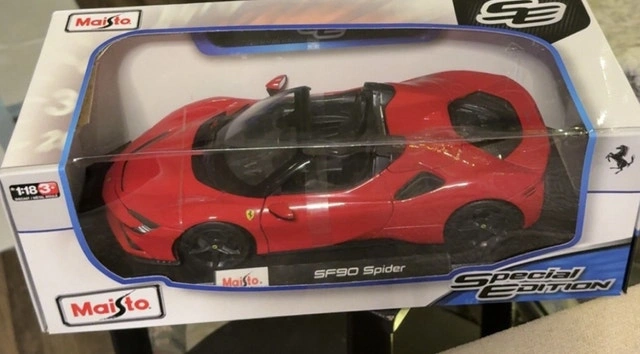 Selling a new, Maisto 1:18 scale model of the Ferrari SF90 Spider Special Edition diecast car, a perfect addition to any car enthusiast's collection or a delightful display piece. The intricate details and vibrant finish capture the essence of this iconic sports car. It has been kept in its original packaging and is in mint condition.