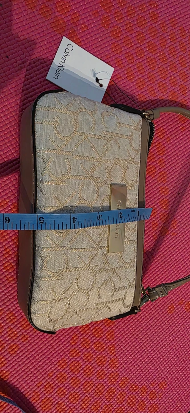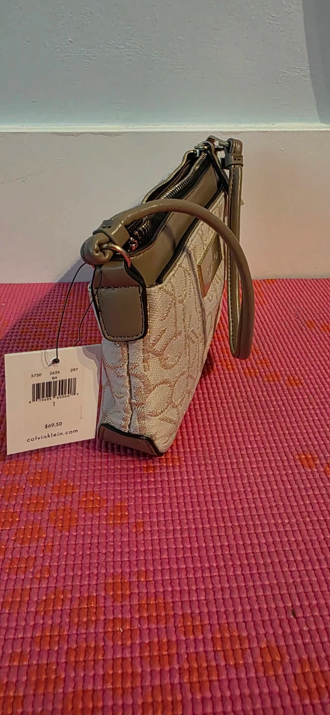 Brand new, with tag, Calvin Klein wristlet pouch, beige with a gold monogram print. It features a secure zippered closure and a wrist strap. Perfect for carrying essentials on the go! A pocket in the front and one in the back. Also, multi card slots and small pocket in the center pocket.