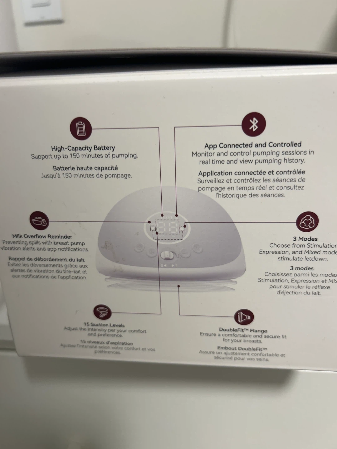 This is the Momcozy Mobile Flow wearable double electric breast pump. It supports up to 150 minutes of pumping with its high-capacity battery. Choose from 3 modes and 15 suction levels to customize your comfort. The app connects for controlled sessions and real-time pumping history.
