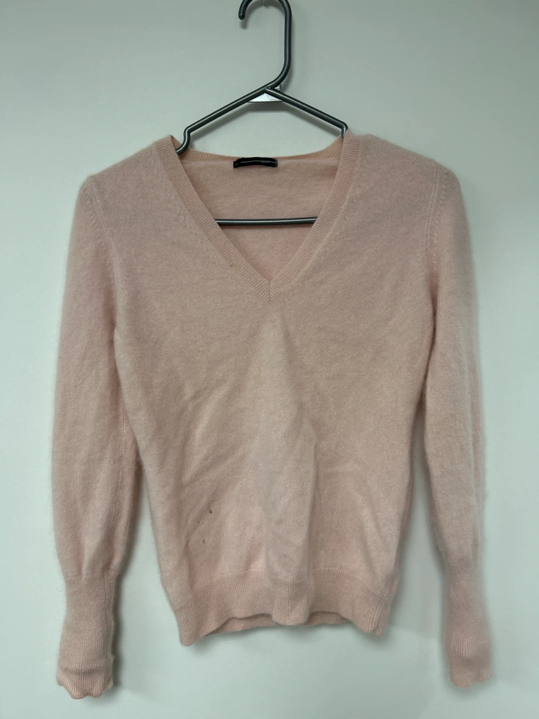 This is a soft pink v-neck sweater from Jaidan. It's made from a fine knit material. A classic layering piece for cooler weather!