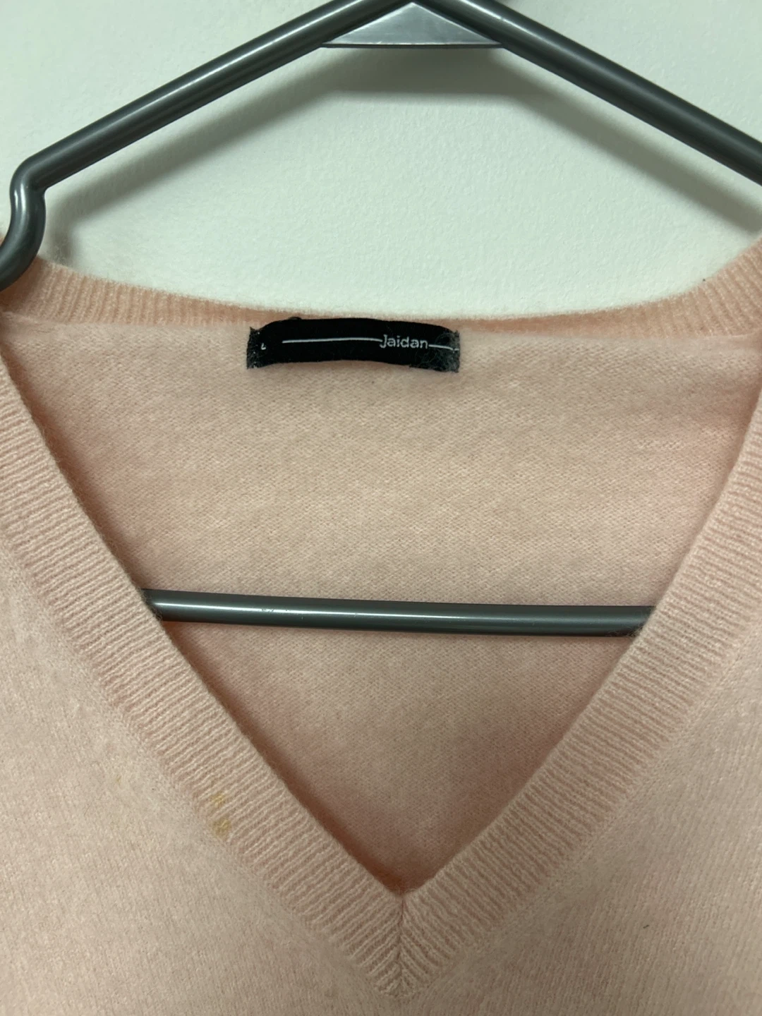 This is a soft pink v-neck sweater from Jaidan. It's made from a fine knit material. A classic layering piece for cooler weather!