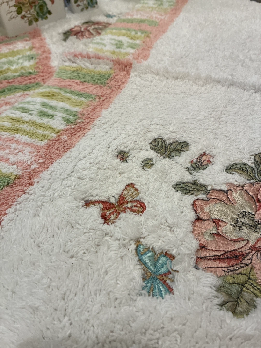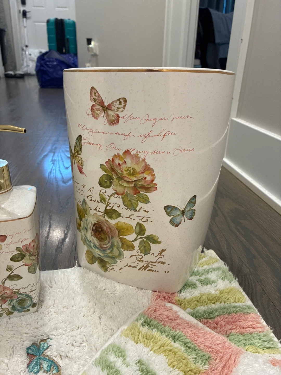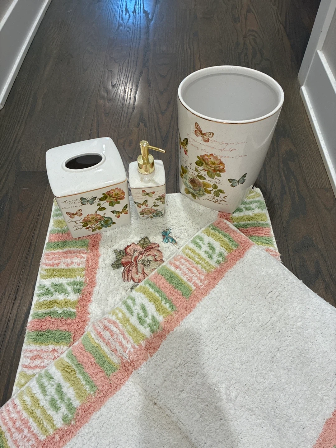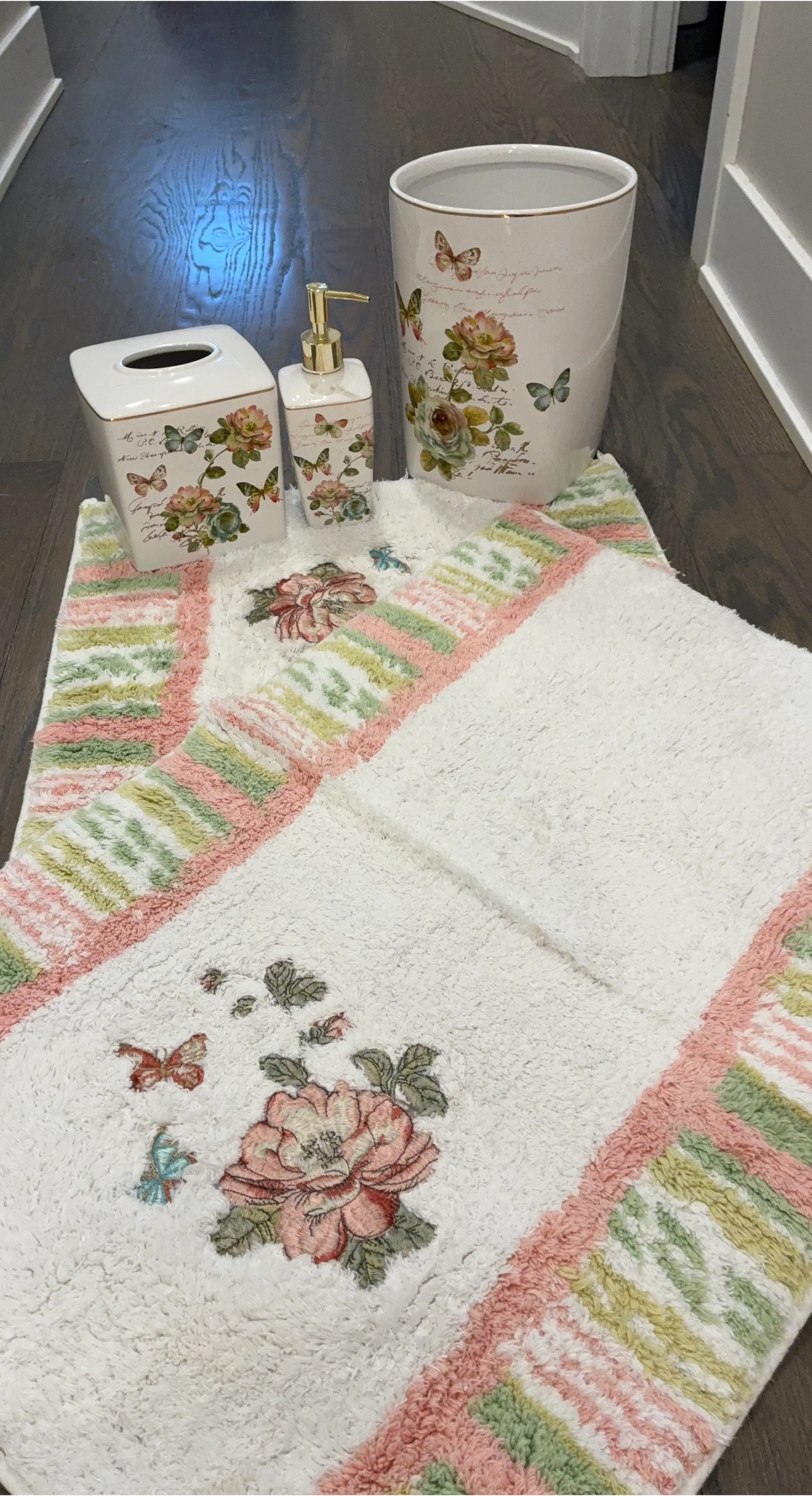 This set includes a tissue box cover, soap dispenser, and trash can, all featuring a pink floral and butterfly design. It also comes with two matching bath mats. Preferably wanting to sell as a bundle - open to offers