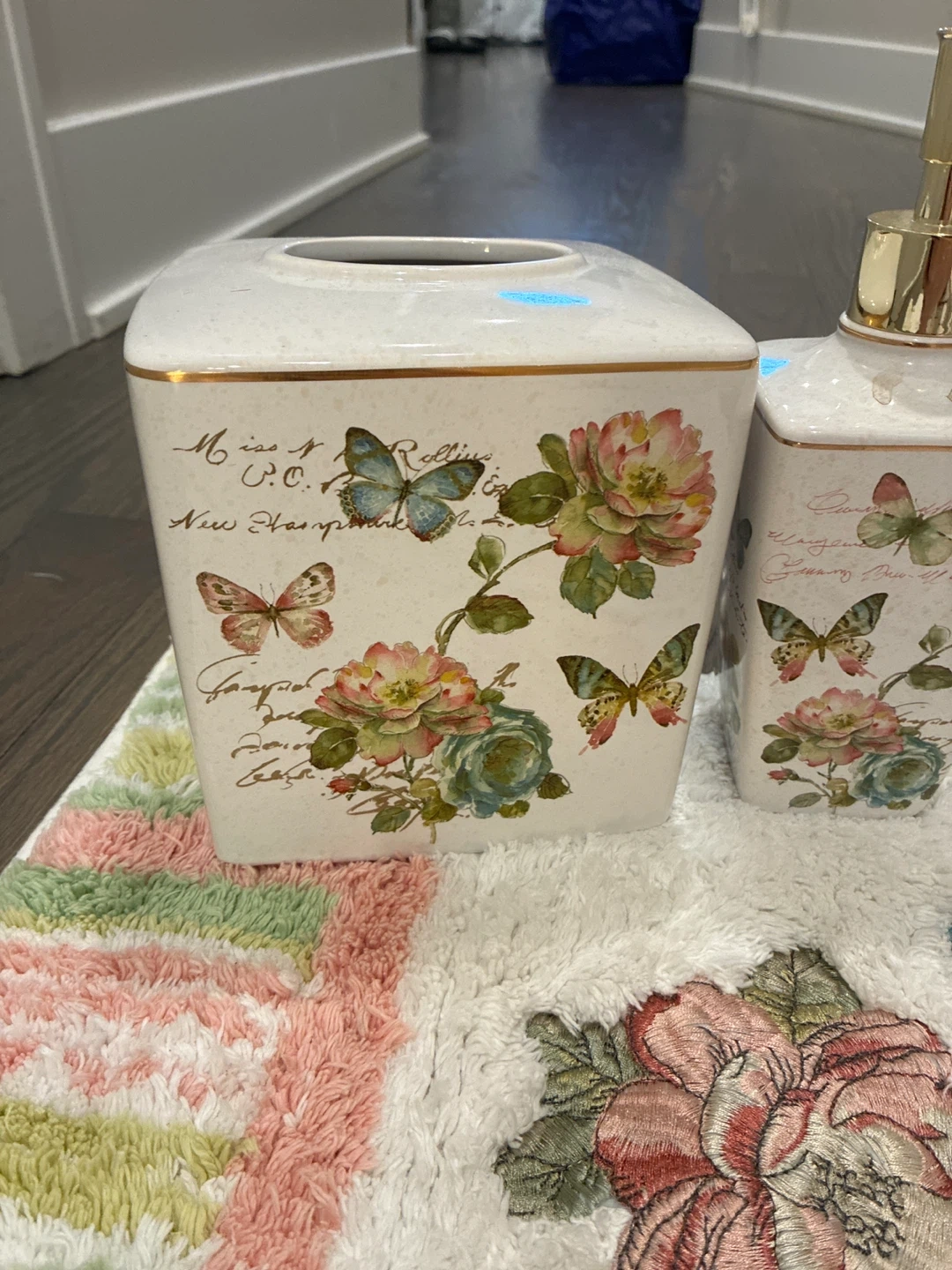 This set includes a tissue box cover, soap dispenser, and trash can, all featuring a pink floral and butterfly design. It also comes with two matching bath mats. Preferably wanting to sell as a bundle - open to offers