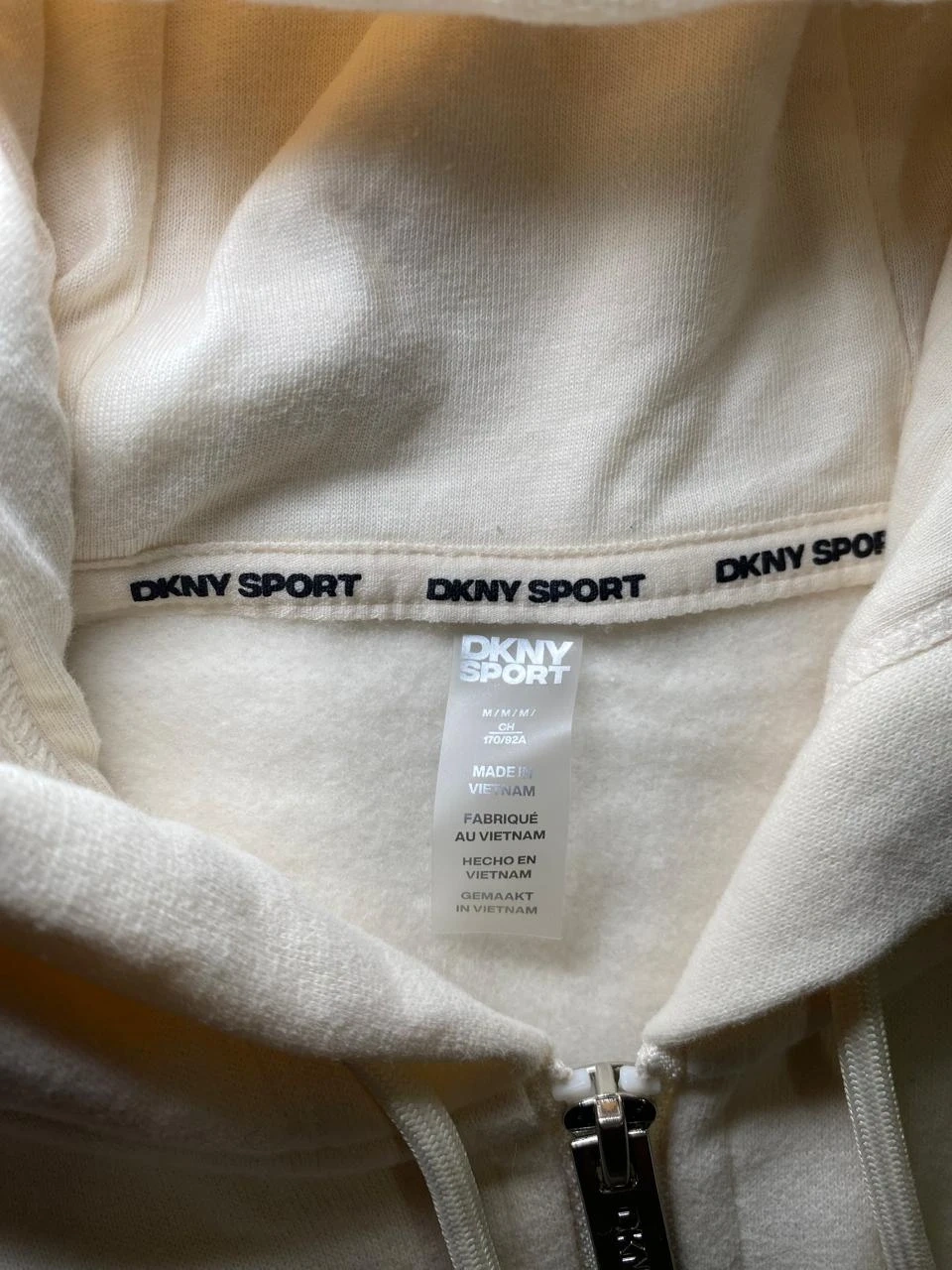 This is a DKNY Sport zip-up hoodie in a cream colour. It's a size medium and made of cotton. It's perfect for casual wear or light workouts! Women's