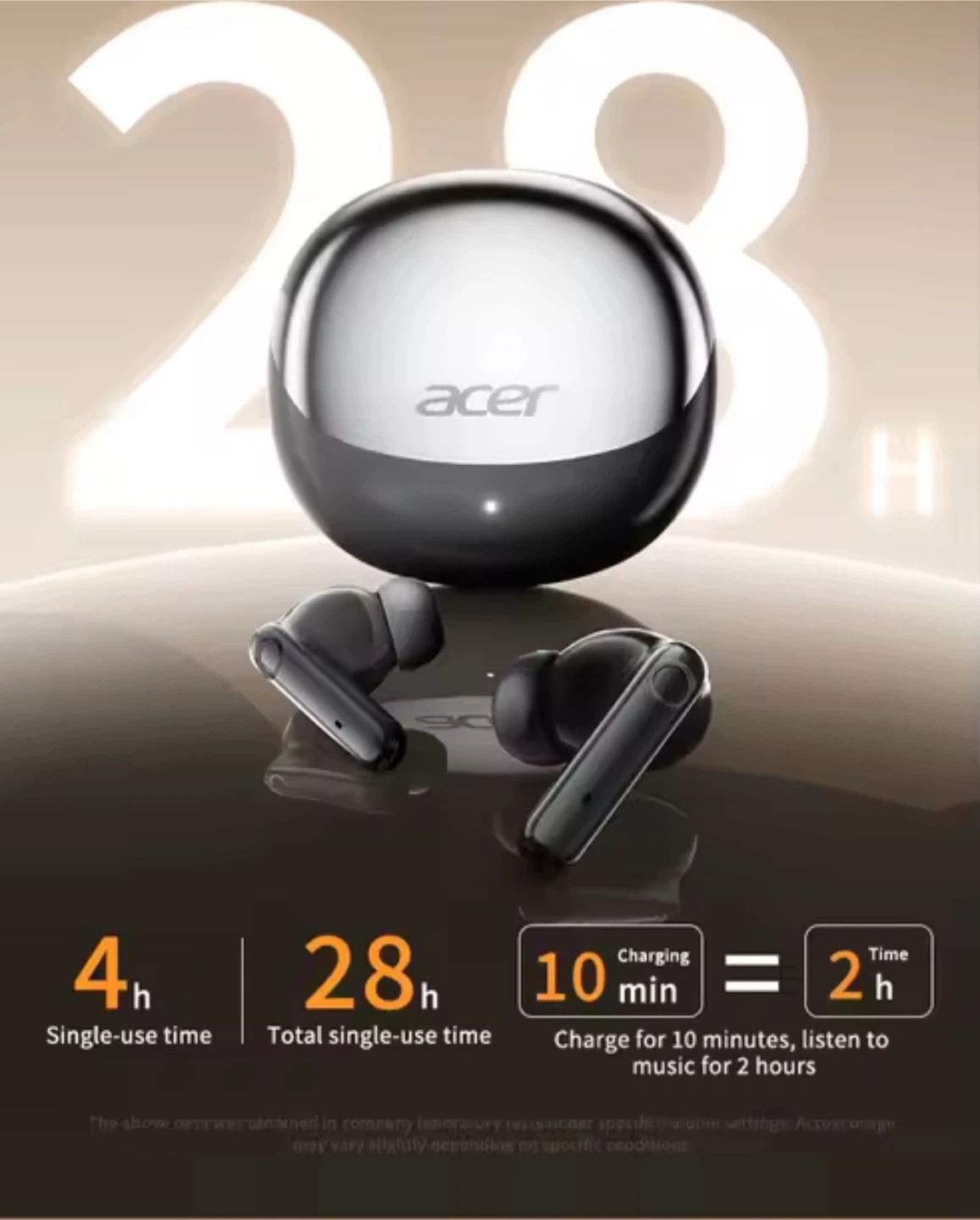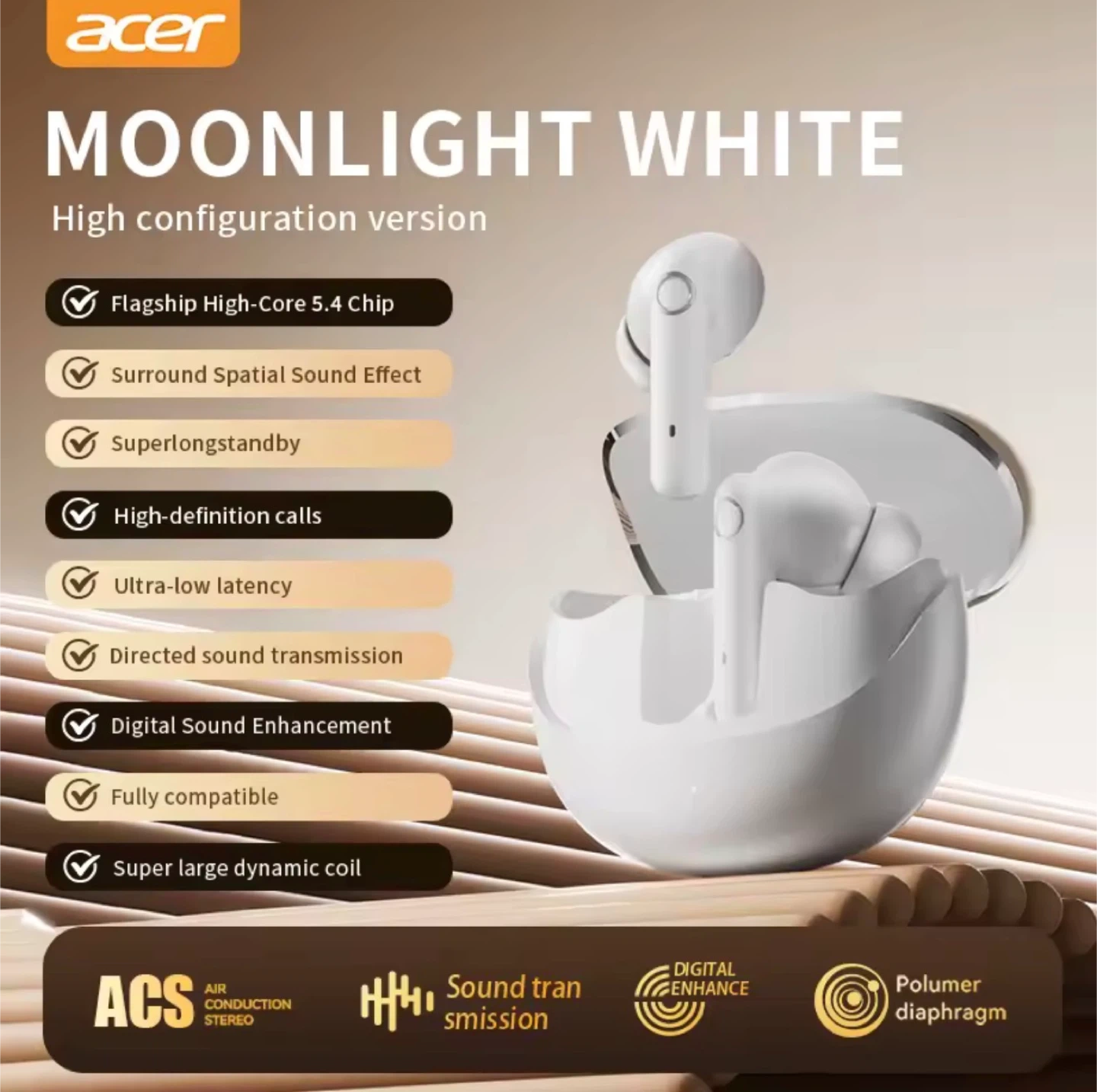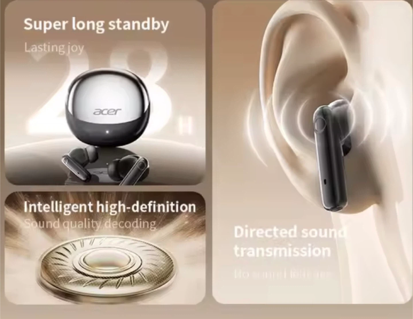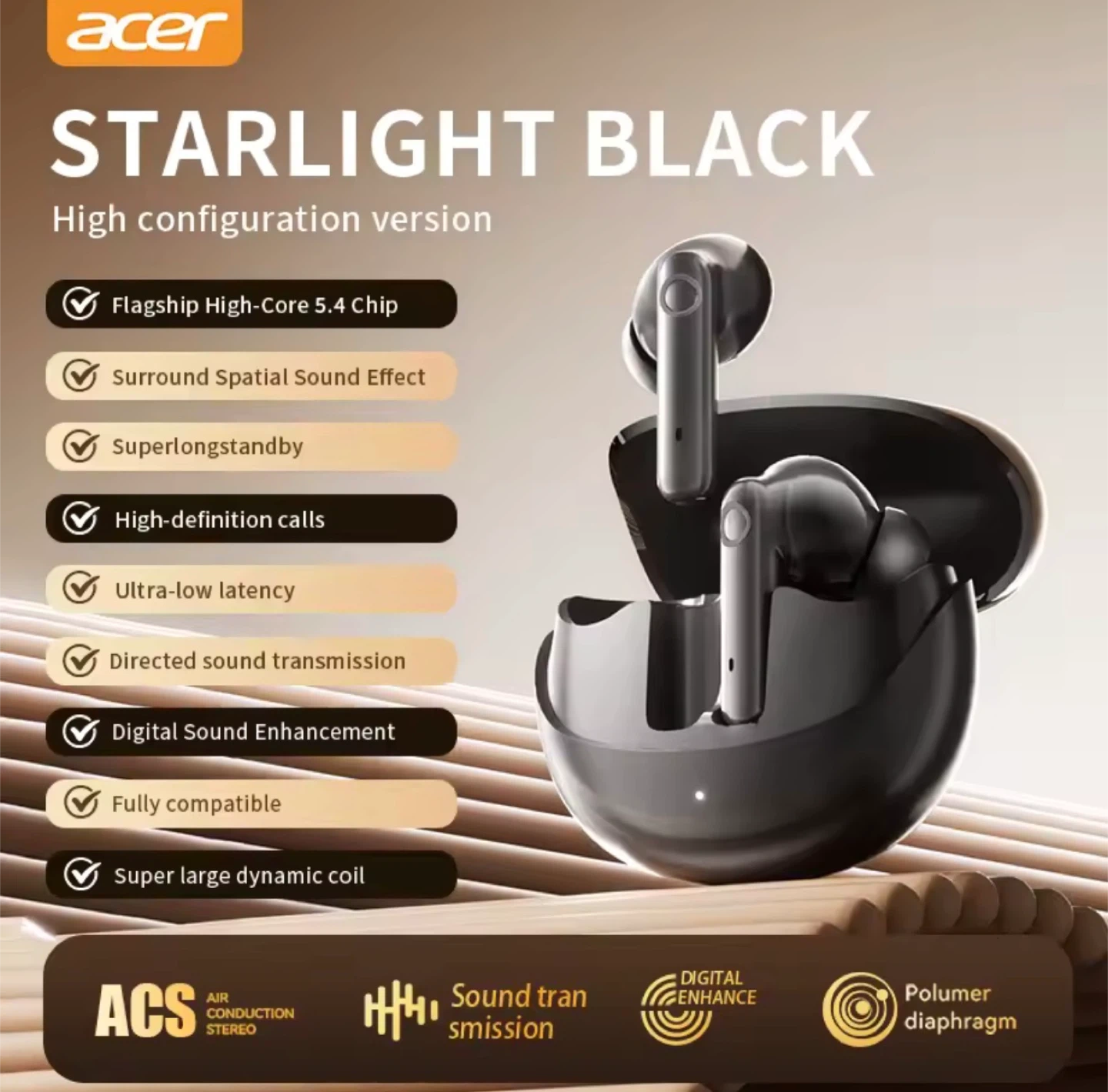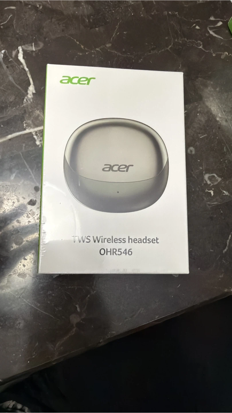Acer TWS wireless headset with a super long standby time. Features intelligent high-definition sound quality decoding and directed sound transmission. Includes a polymer diaphragm for enhanced audio.