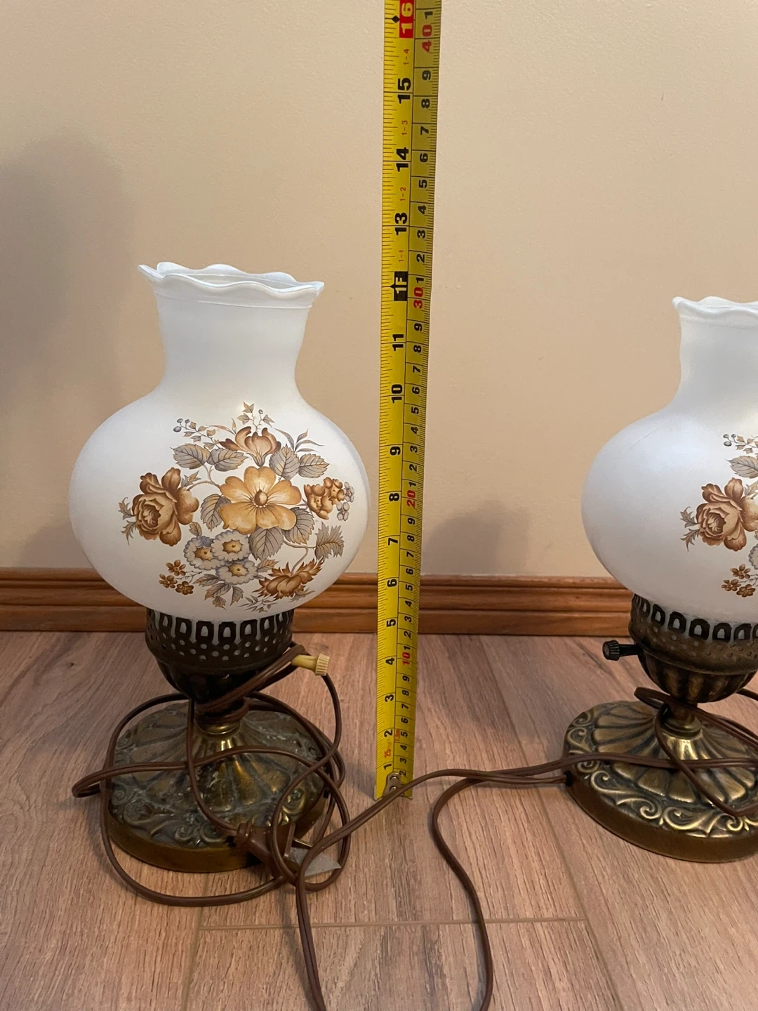 Two vintage accent lamps with a white frosted glass shade featuring a floral pattern. They have a brass-toned metal base with intricate detailing. Each lamp is approximately 15 inches tall. Add a touch of classic charm to any room!