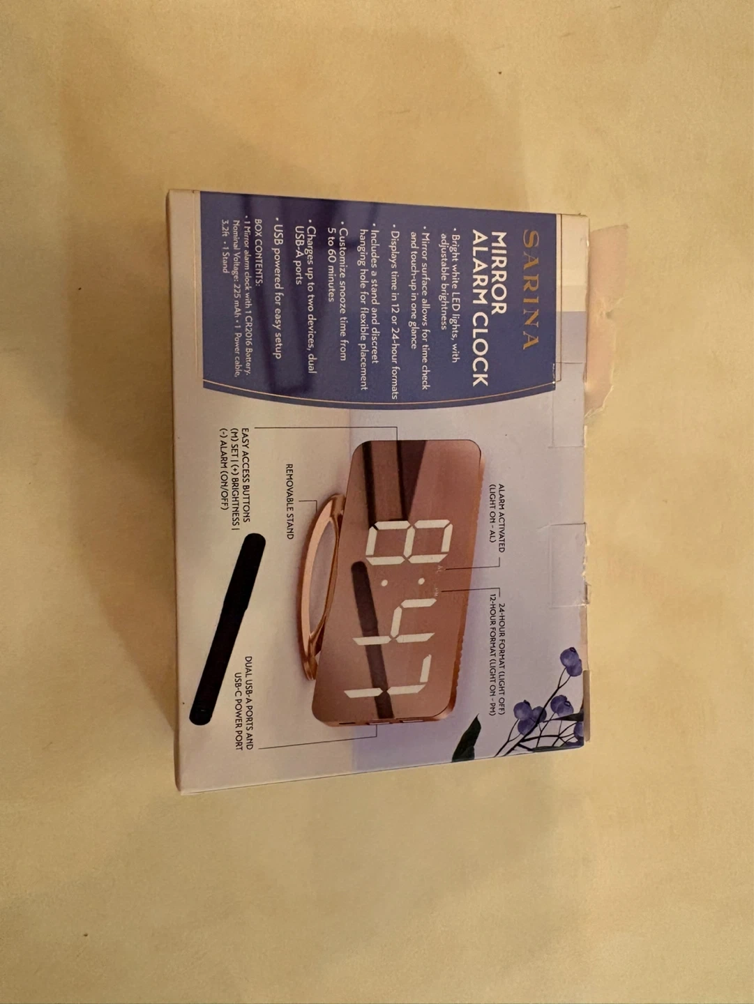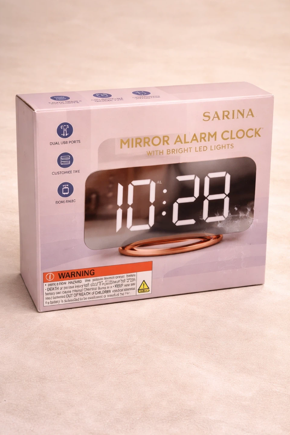 keywords: alarm clock, mirror clock, LED clock, digital clock, bedside clock, modern clock, USB clock, dual USB, snooze alarm, LED display, desk clock, home decor, minimalist, Sarina clock