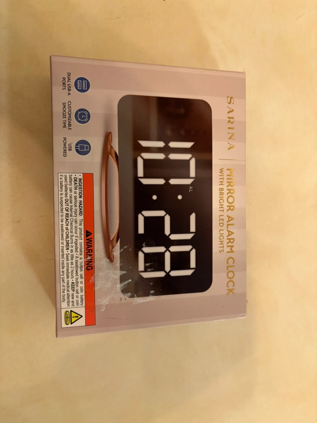 keywords: alarm clock, mirror clock, LED clock, digital clock, bedside clock, modern clock, USB clock, dual USB, snooze alarm, LED display, desk clock, home decor, minimalist, Sarina clock