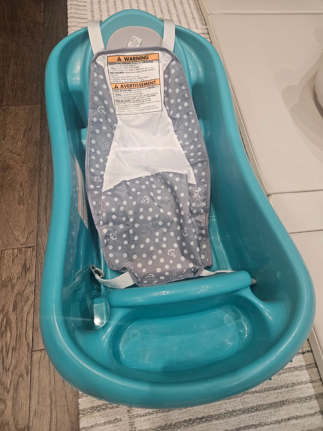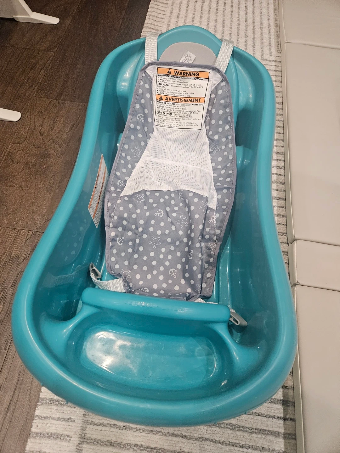 This teal baby tub by The First Years is designed for newborns up to 25 lbs. It comes with a supportive sling for infants. The non-slip surface helps keep baby secure.