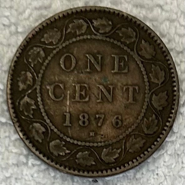 This is an 1876-H Canadian Large Cent coin, a tangible piece of history! It's a great find for collectors or anyone interested in Canadian heritage. Cash accepted.
