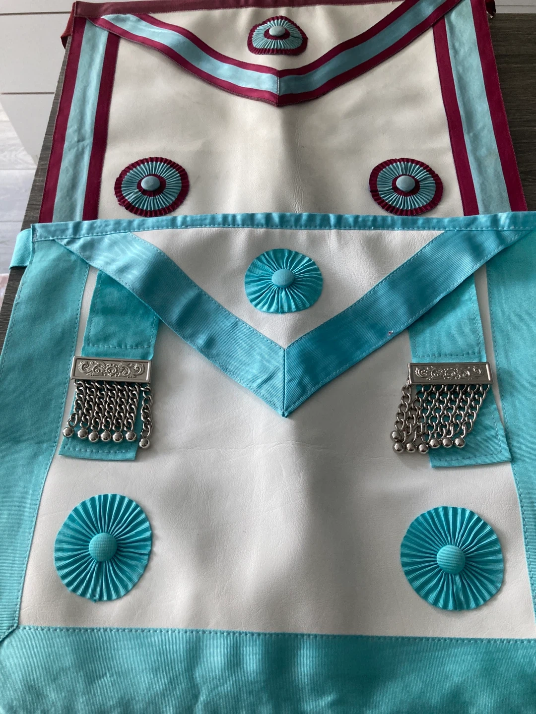 Here are two Masonic aprons. One is white with burgundy and light blue accents. The other is white with turquoise accents and silver chains. They're in good condition and ready for a new owner!