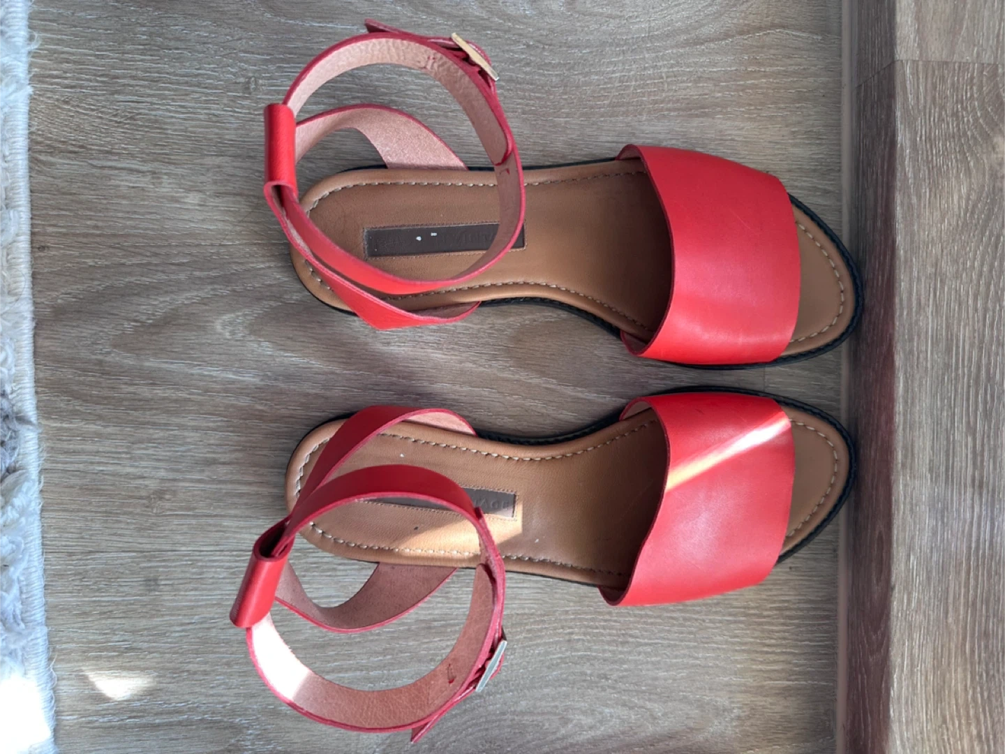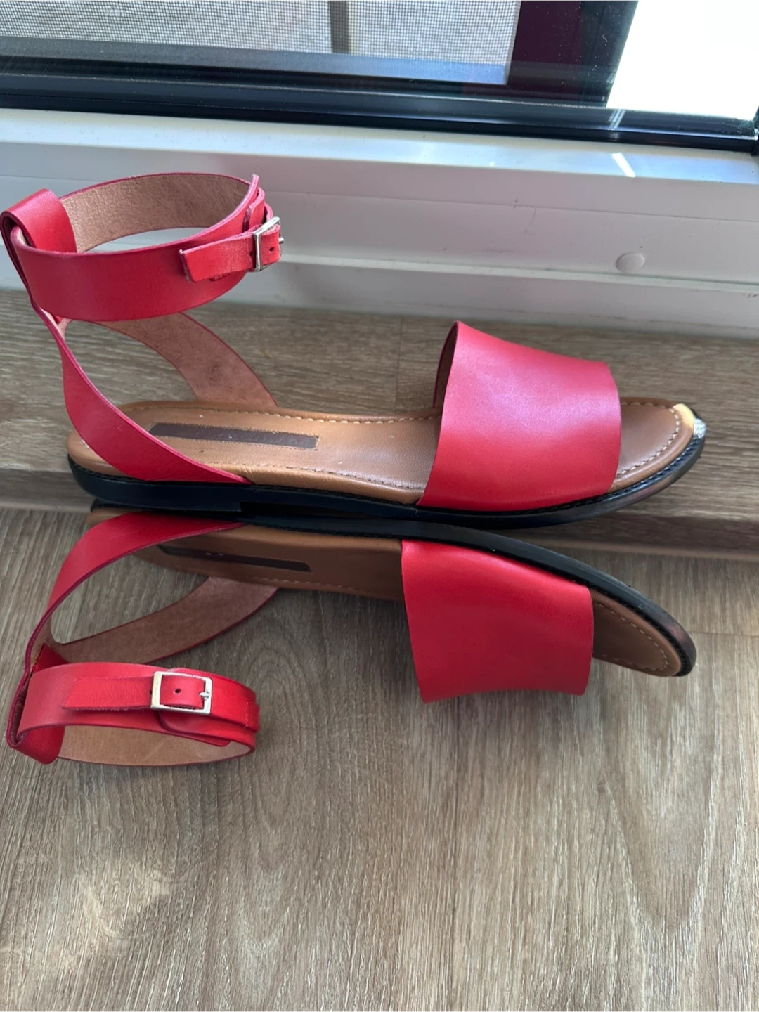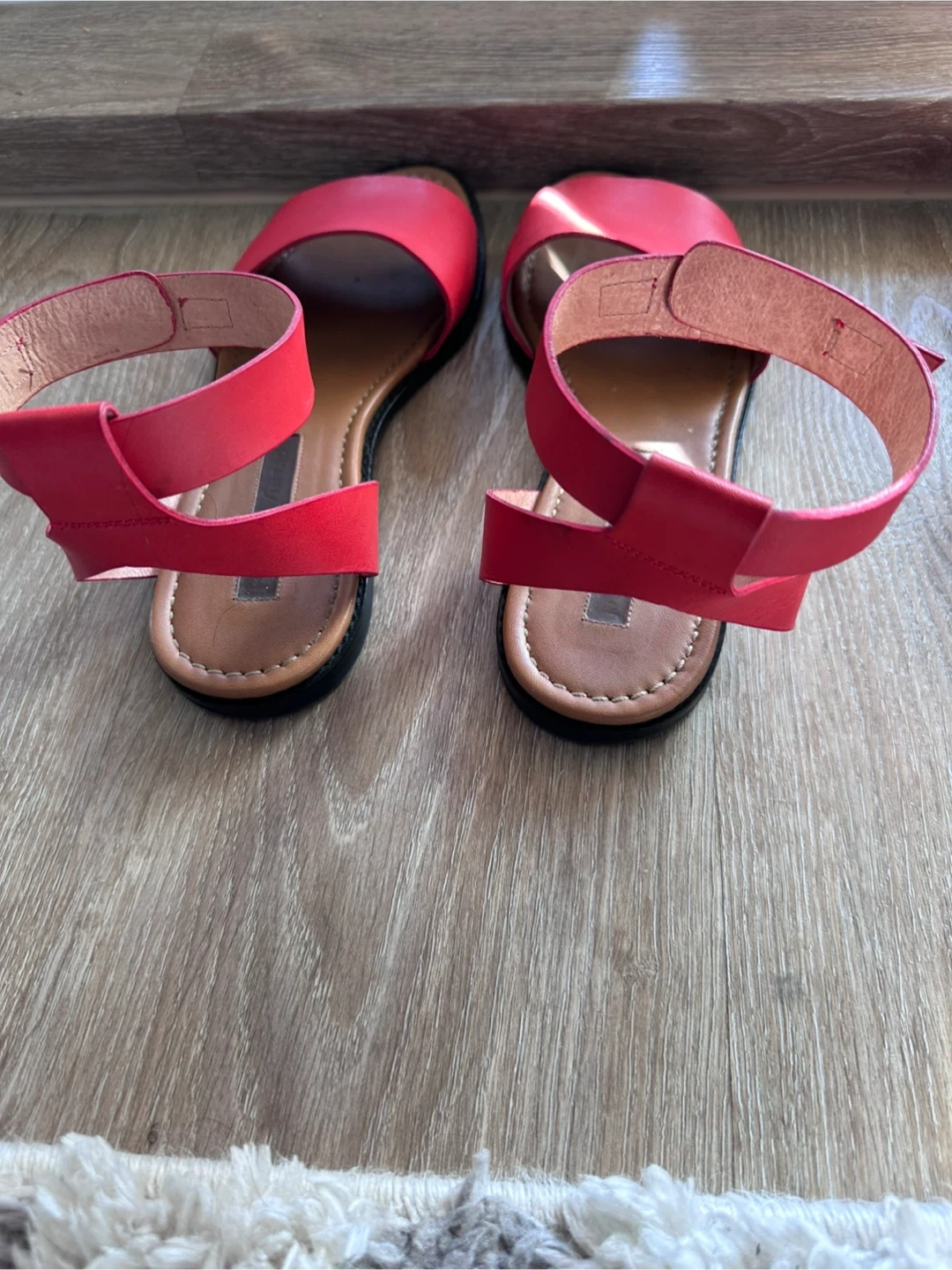These red leather sandals feature an adjustable ankle strap with a buckle closure. The footbed appears to be made of genuine leather. They offer a comfortable, flat sole for everyday wear. Handmade