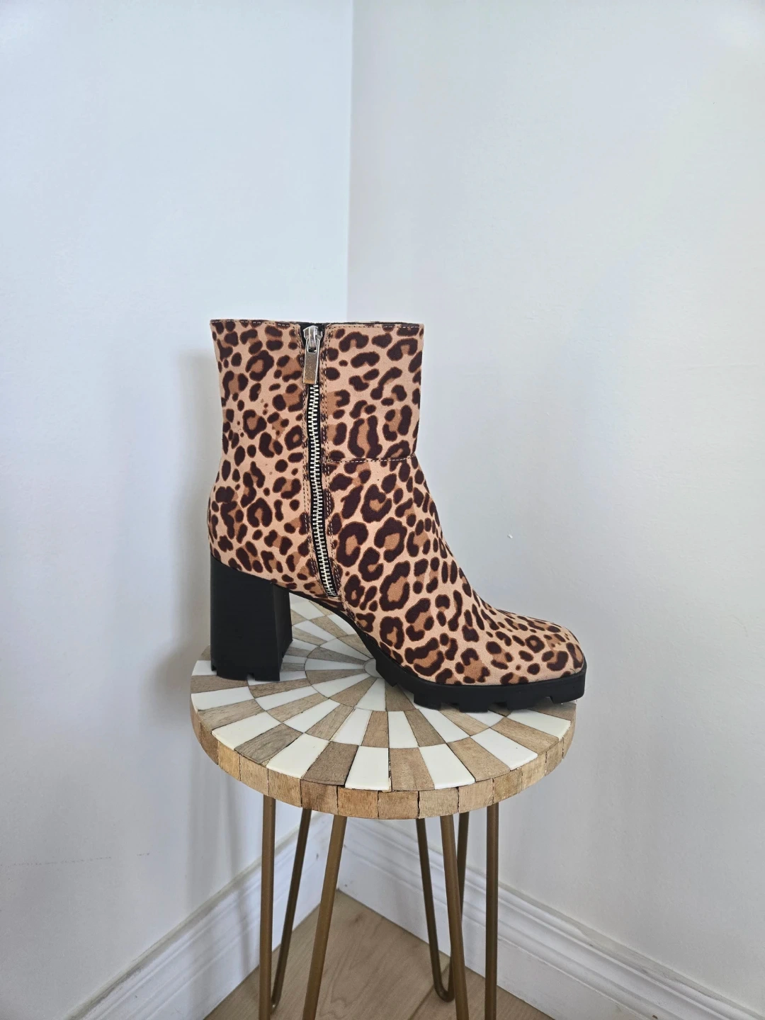 These Design Lab ankle boots feature a cool leopard print design. They have a side zipper for easy on and off. Man-made material construction with a chunky block heel and lug sole. Perfect for adding a bit of flair to any outfit!