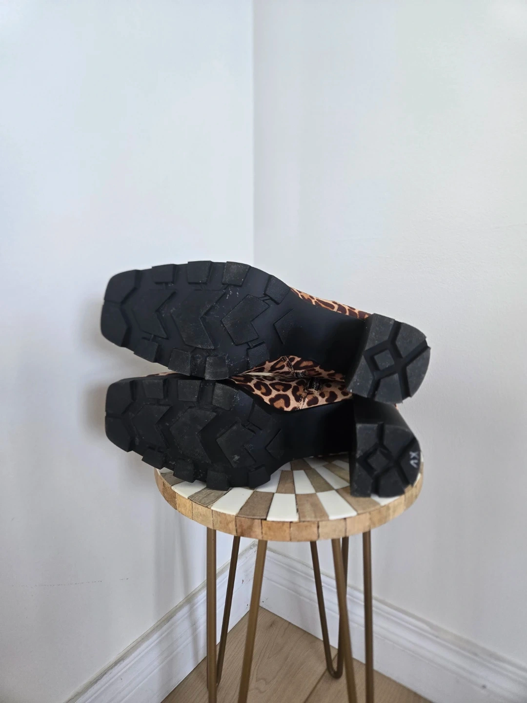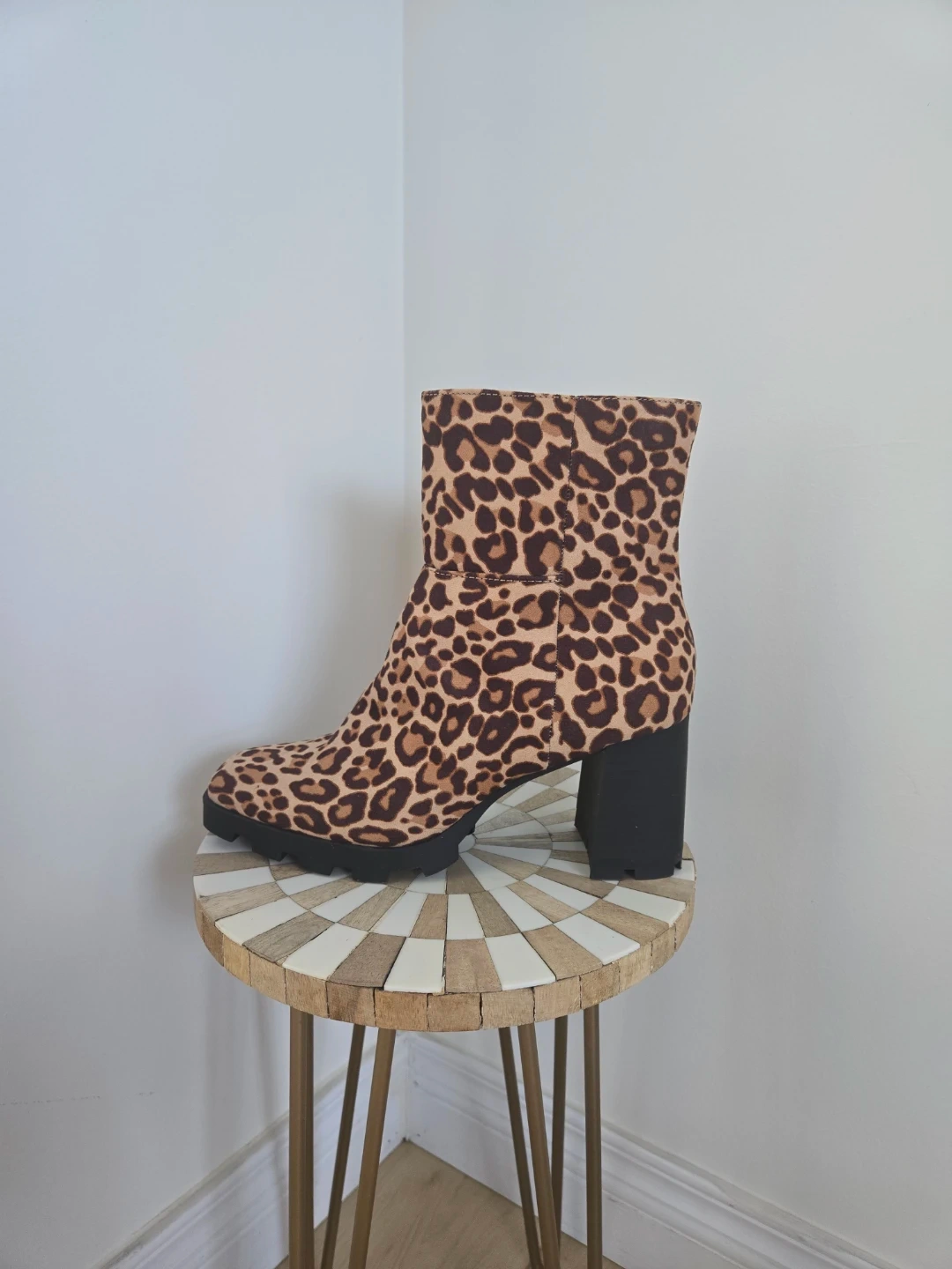 These Design Lab ankle boots feature a cool leopard print design. They have a side zipper for easy on and off. Man-made material construction with a chunky block heel and lug sole. Perfect for adding a bit of flair to any outfit!