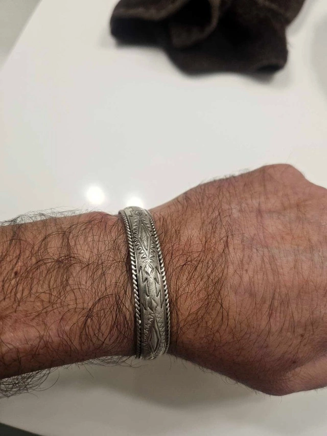 Up for grabs is this stunning, authentic-style Navajo cuff bracelet that's perfect for adding a touch of boho-chic or Western flair to your wardrobe! Crafted from high-quality sterling silver, this piece features exquisite hand-engraved details inspired by traditional Native American motifs—think lightning zigzags, diamond arrowheads, and chevron patterns framed by twisted rope borders. It's got that timeless Southwestern vibe, reminiscent of pieces from the Navajo silversmiths of the American Southwest. Condition: Used - Like new. Cash accepted: Yes. Payment: Cashless payment, Cash accepted.