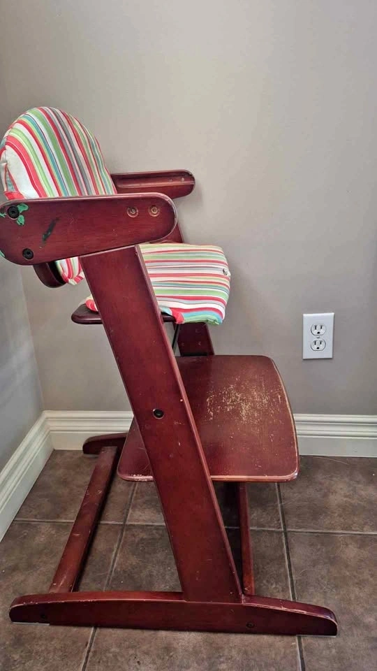 Adjustable Wooden High Chair – Good Used Condition. Solid, sturdy, and built to last! This chair grows with your child from toddler to adult (up to 200 lb). Adjustable seat & footrest. Durable wooden design. Easy to clean. Perfect for dining table, homework, or everyday use. Note: Tray screws are missing (we didn’t use the tray as kids sat at the table with us). This chair served us very well—super reliable and still in great shape! Located in Airdrie.