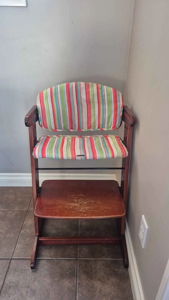 Adjustable Wooden High Chair – Good Used Condition. Solid, sturdy, and built to last! This chair grows with your child from toddler to adult (up to 200 lb). Adjustable seat & footrest. Durable wooden design. Easy to clean. Perfect for dining table, homework, or everyday use. Note: Tray screws are missing (we didn’t use the tray as kids sat at the table with us). This chair served us very well—super reliable and still in great shape! Located in Airdrie.