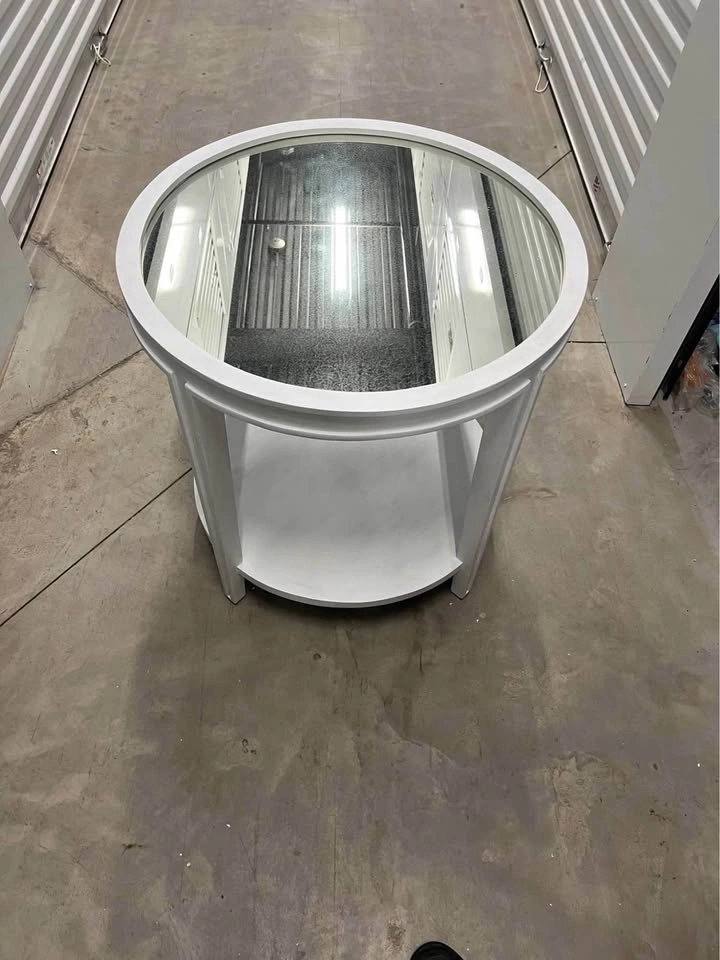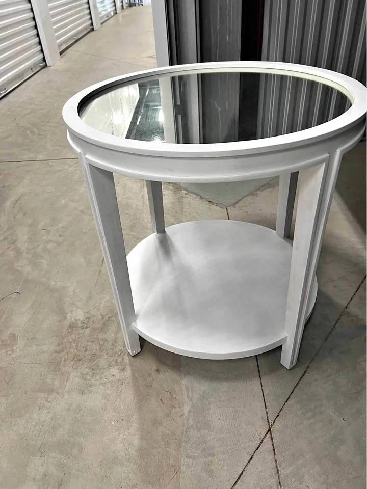 New white round side table. Mirrored top and handy lower shelf. Dimensions are 26 inches round x 26 inches high. Weighs 51 pounds. All sales final.