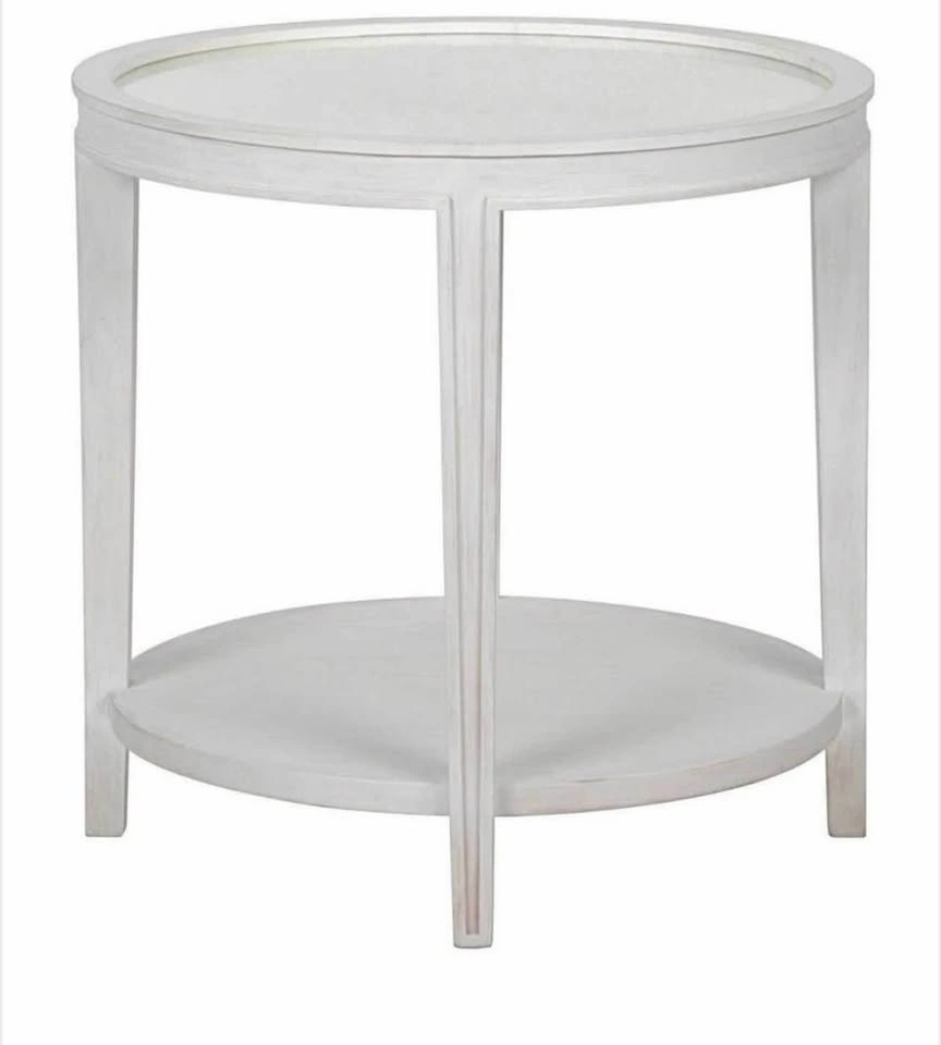 New white round side table. Mirrored top and handy lower shelf. Dimensions are 26 inches round x 26 inches high. Weighs 51 pounds. All sales final.