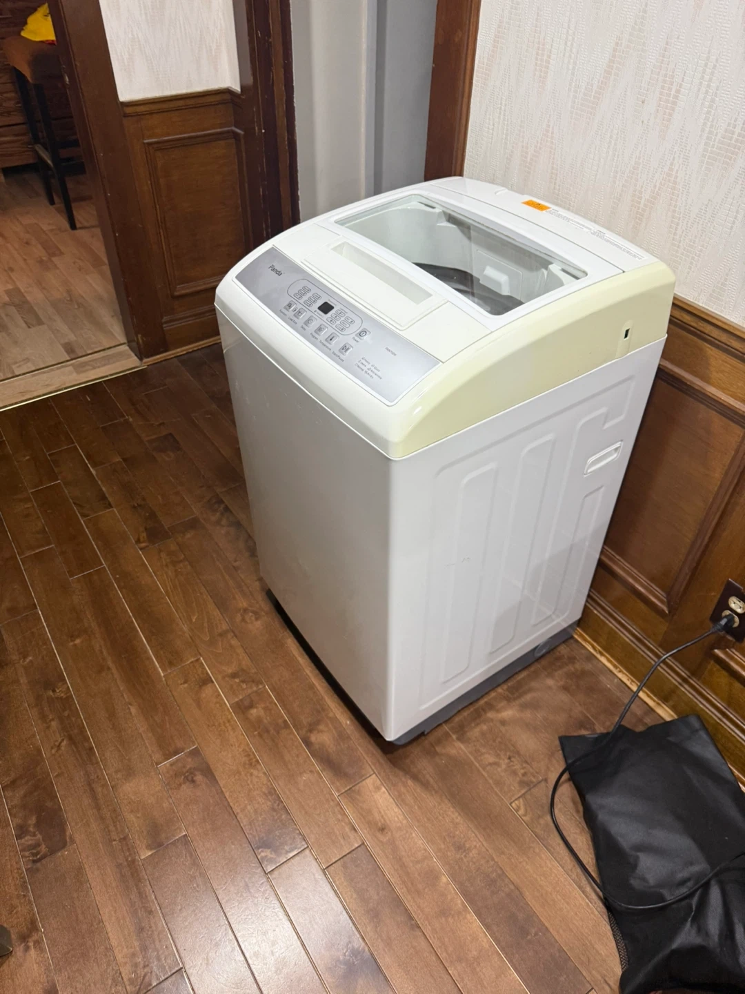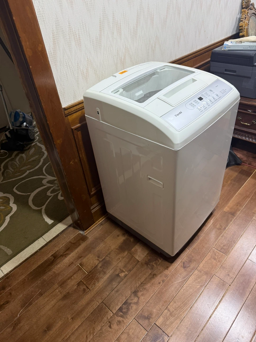 This is a Panda brand portable top-load washing machine. It's compact and suitable for small spaces. The unit features multiple wash cycles and a transparent lid.