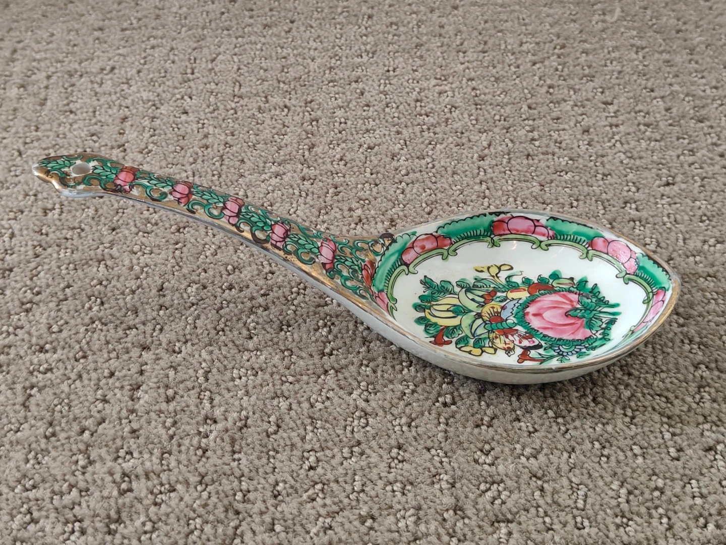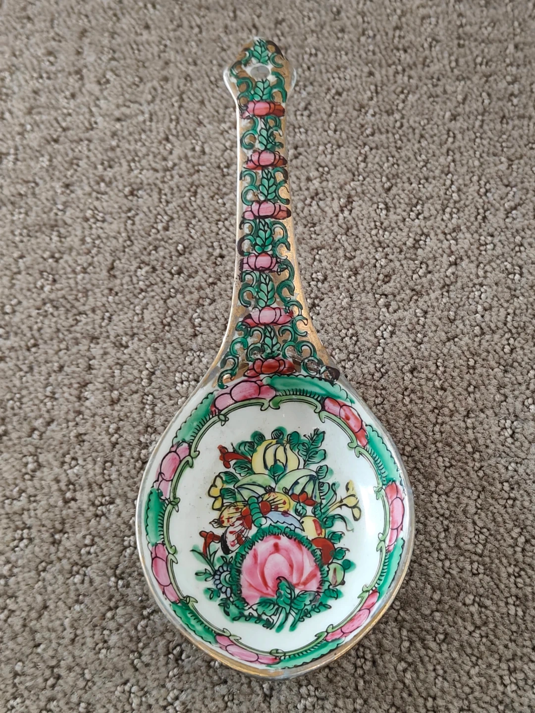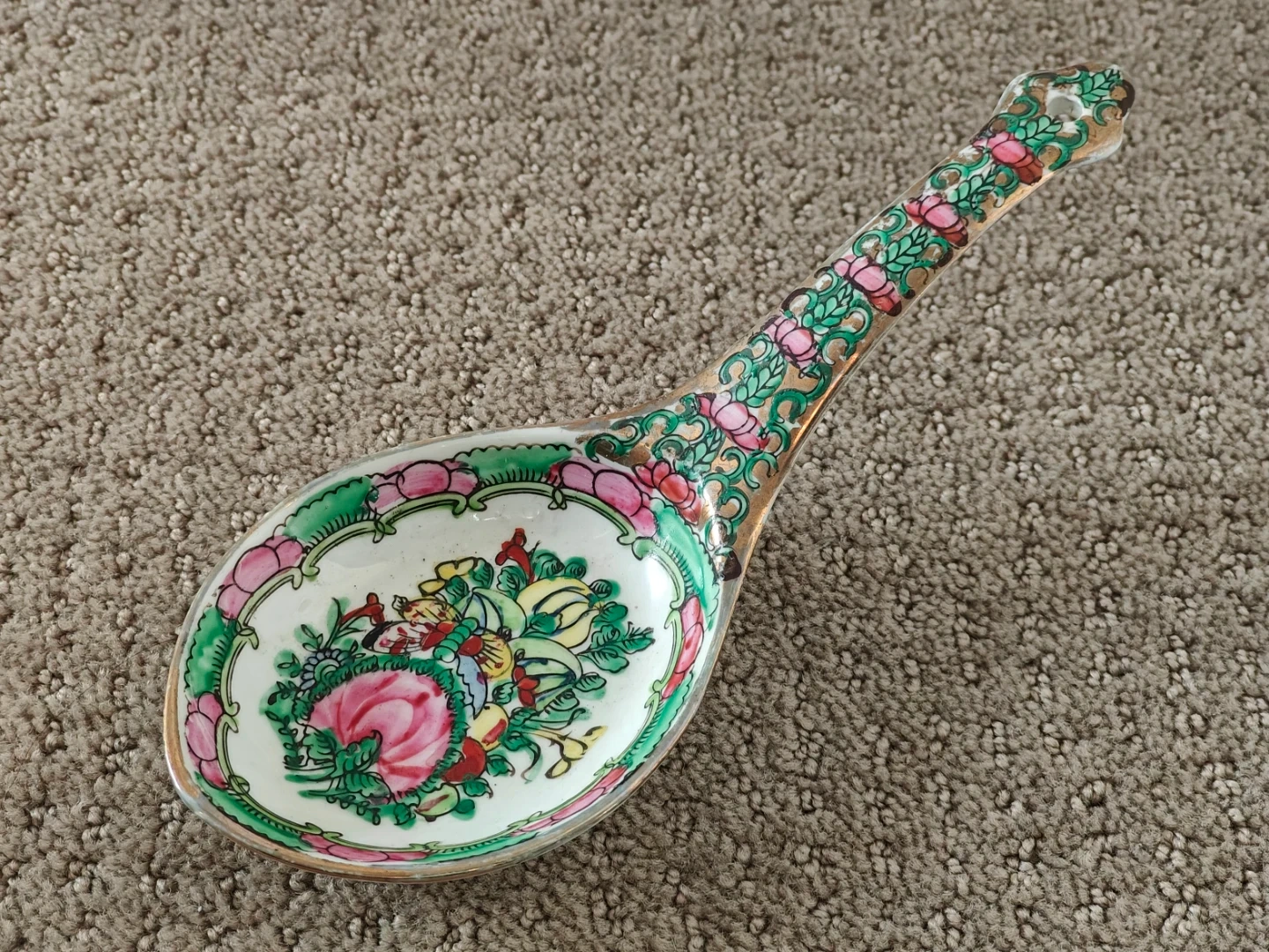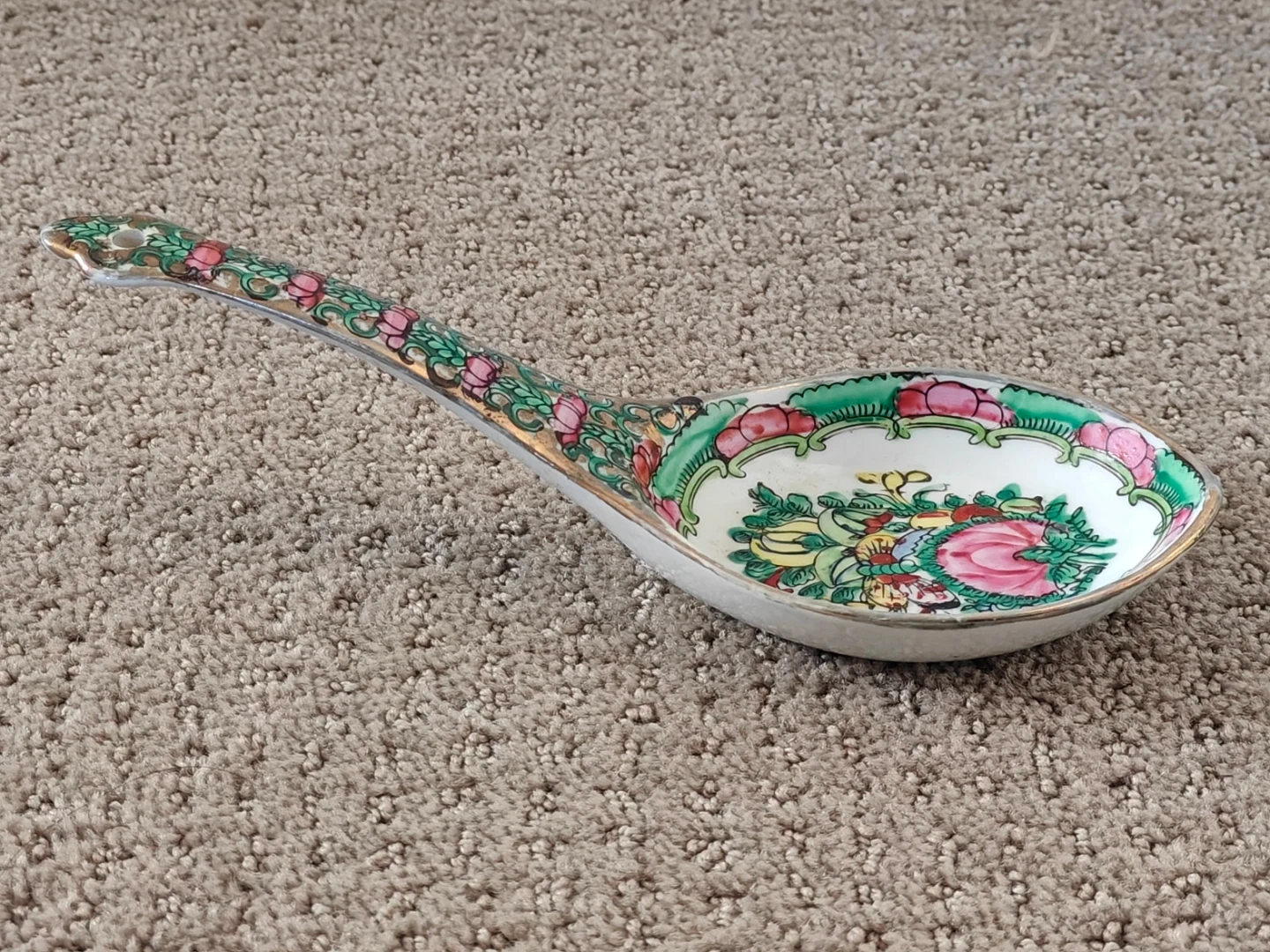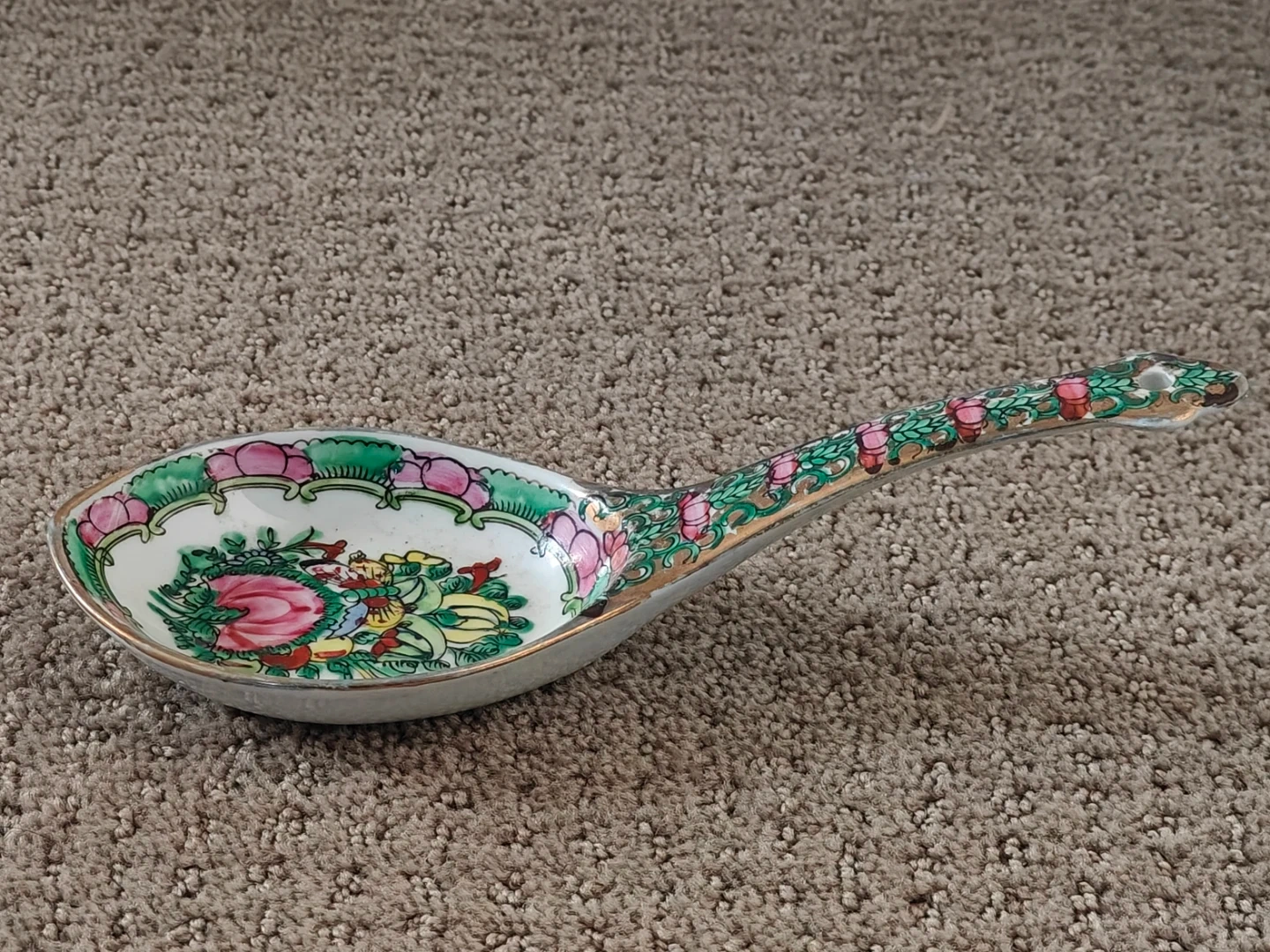 I am selling an Exquisite Antique Chinese Asian Vintage Large Vintage Chinese Rose Canton Porcelain Serving Soup Spoon - 8" - Gold Gilt Hand-Painted with Gold Gilt Large Soup Spoon in new condition. Never been used and no chips or cracks on the spoon. Elevate your collection with this exquisite vintage Chinese Rose Medallion porcelain soup spoon. This is not a small dessert spoon but a generously sized, hand-painted piece in the highly sought-after Canton Famille Rose style. In pristine, new/unused condition, it is free of any chips or cracks, and the vibrant colors and gold gilt are perfectly preserved.