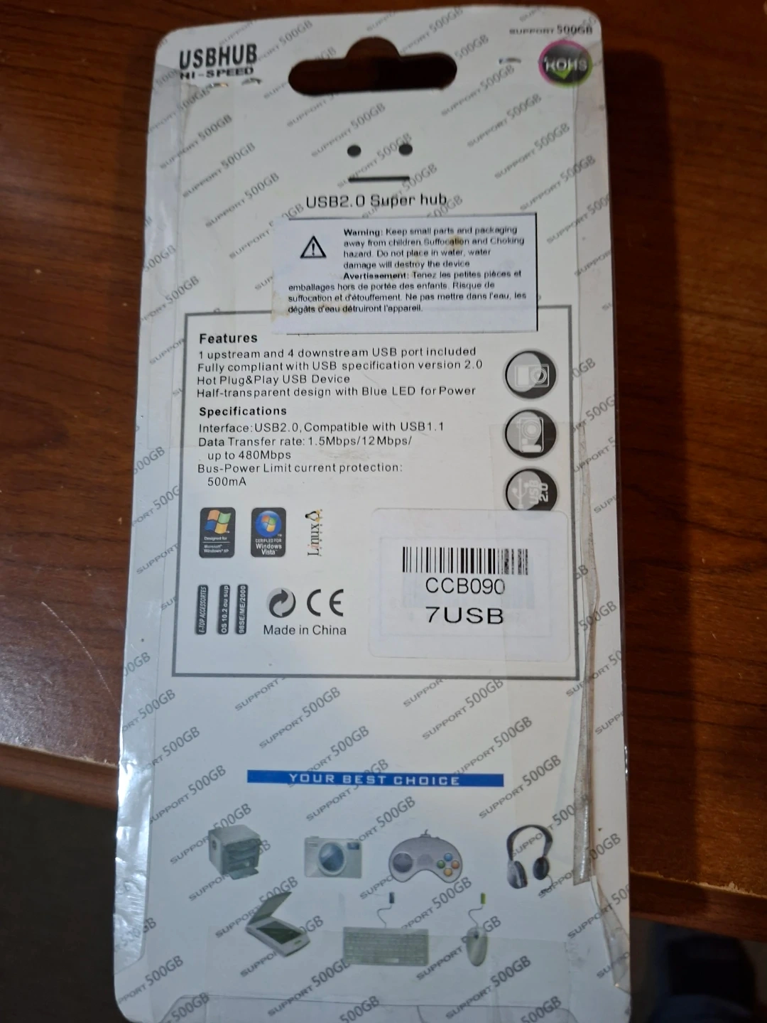 This is a USB 2.0 Hi-Speed hub with 4 upstream and 4 downstream ports. It's Plug and Play with blue LED power indicators. Supports data transfer rates up to 480Mbps.