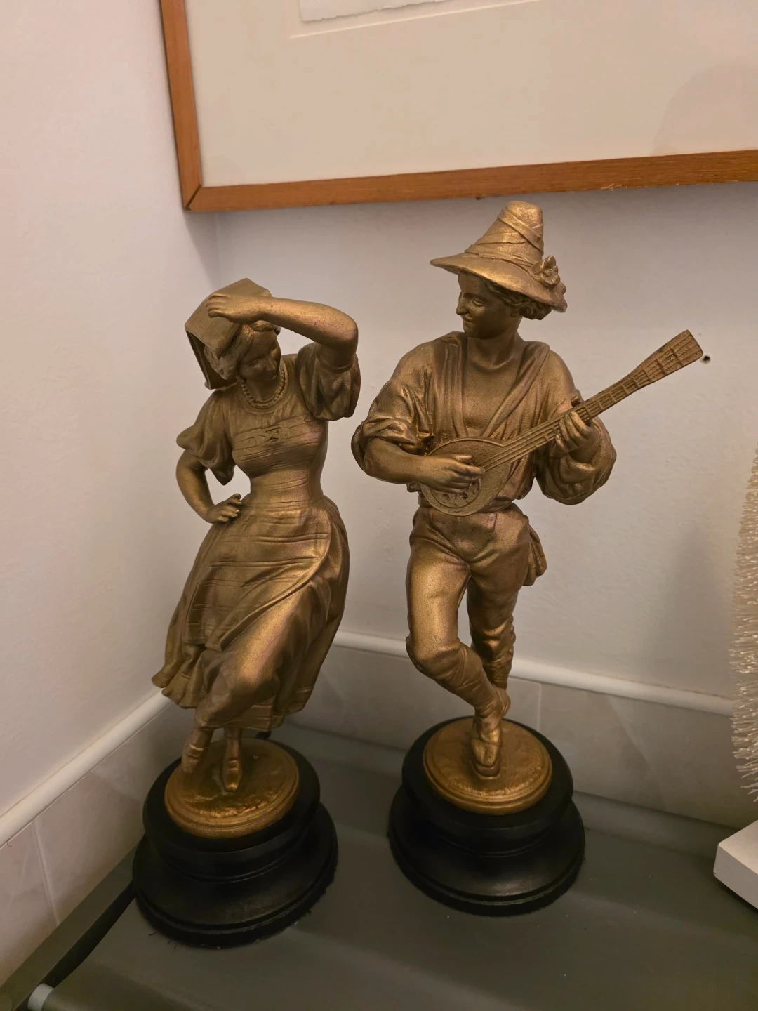 A pair of vintage gold-tone figurines depicting a couple. One figure plays a lute-like instrument while the other dances, holding her headscarf. Both stand on decorative black bases. They're made of a metallic material with a subtle sheen.