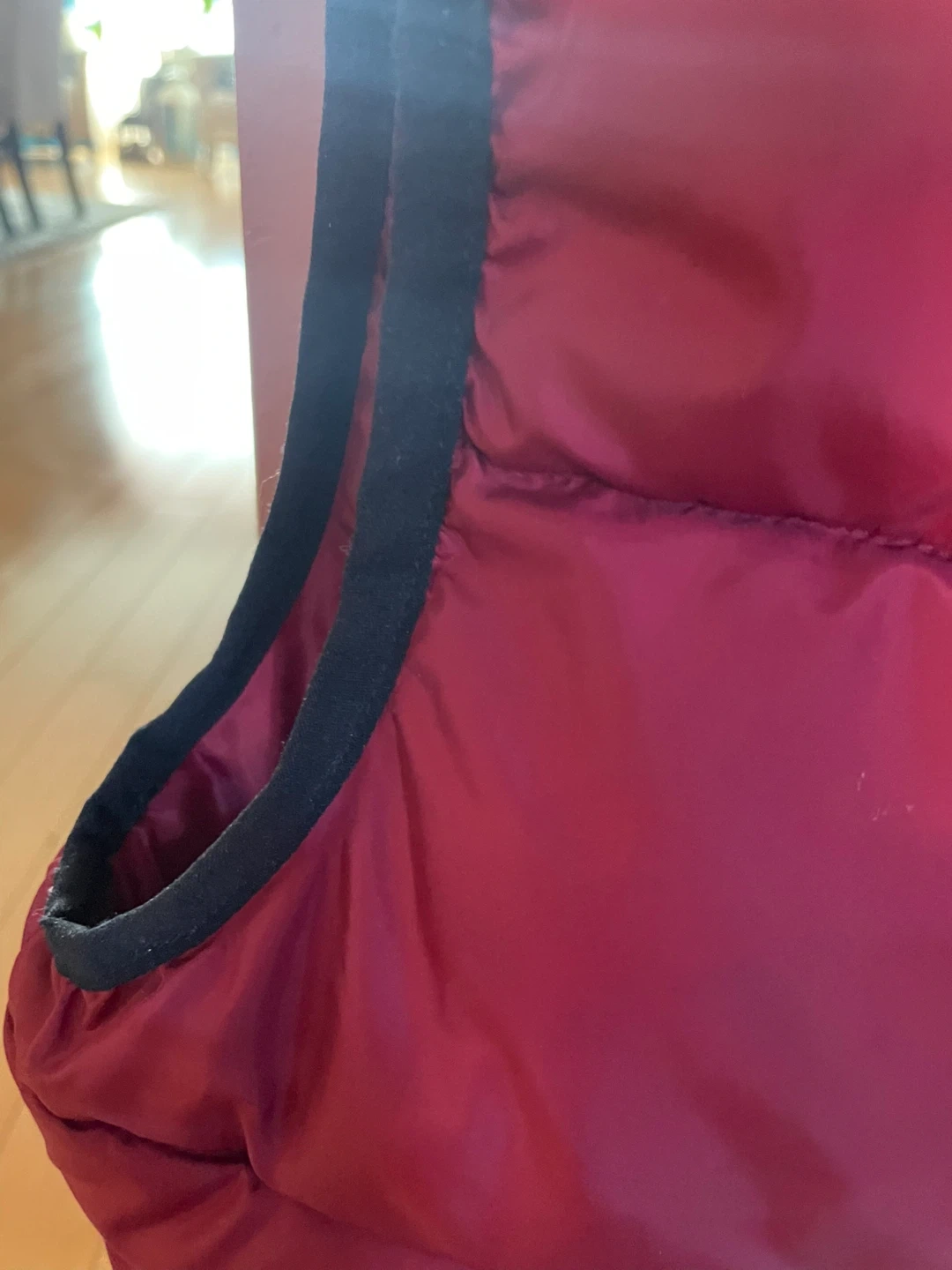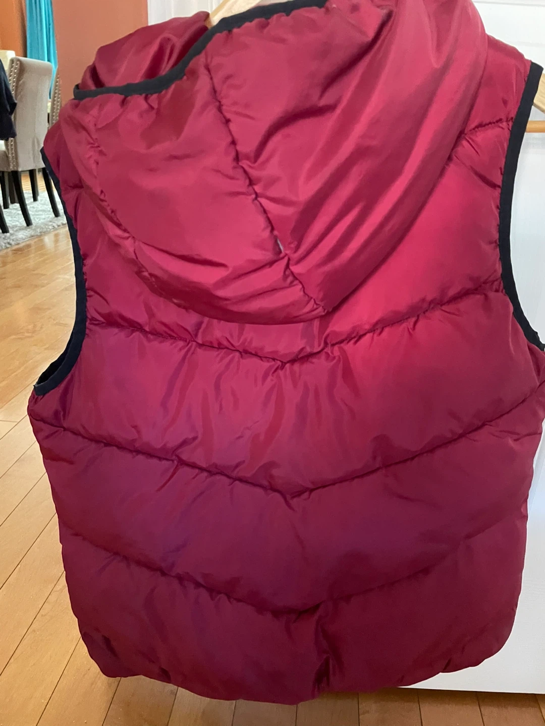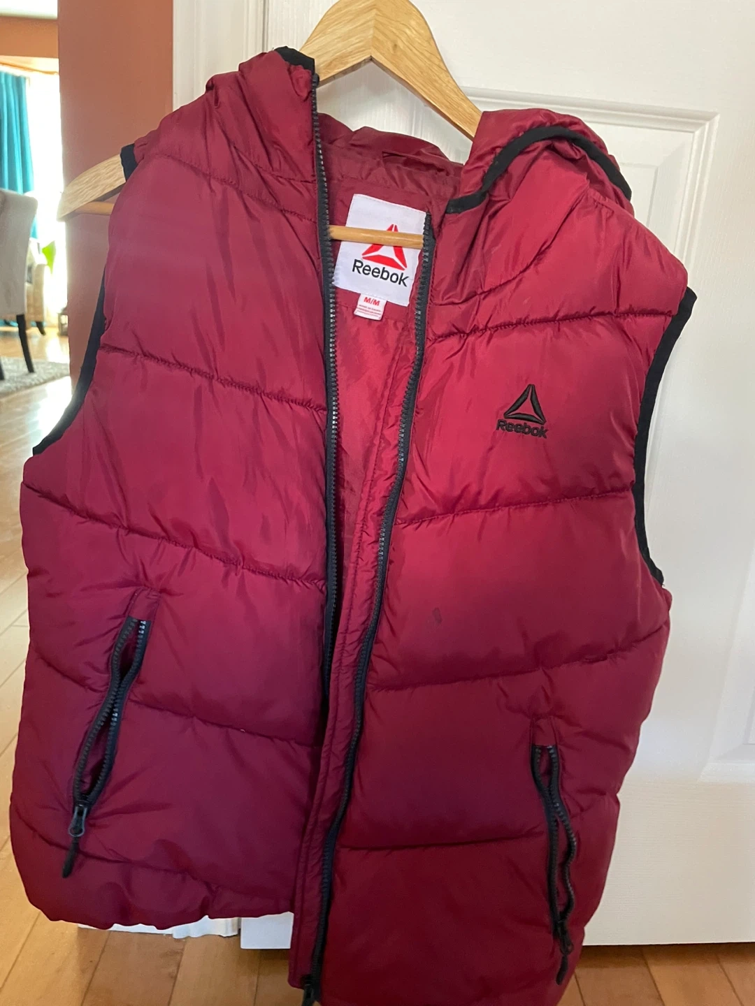 Reebok puffer vest in a deep red colour. It's a size M/M. Features zippered pockets on the front. Great for layering during cooler weather!