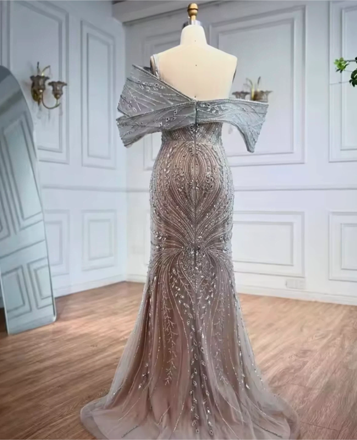Stunning off-the-shoulder evening gown covered in intricate beading and sequins. It features a mermaid silhouette with a flowing overlay at the shoulders. Perfect for formal events or galas!