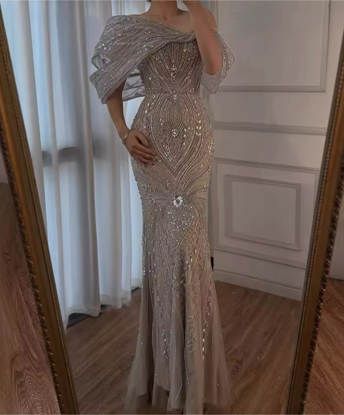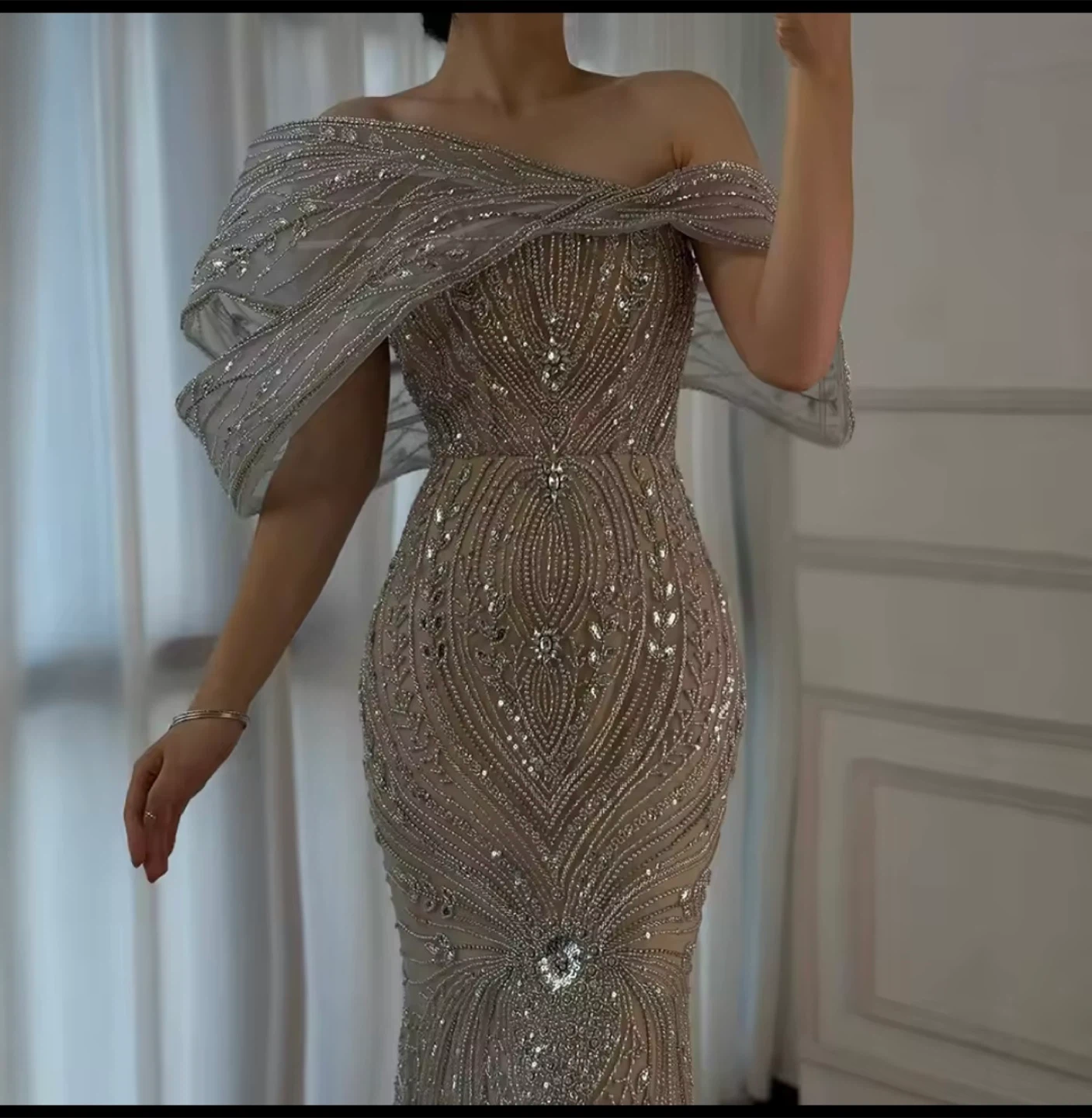 Stunning off-the-shoulder evening gown covered in intricate beading and sequins. It features a mermaid silhouette with a flowing overlay at the shoulders. Perfect for formal events or galas!