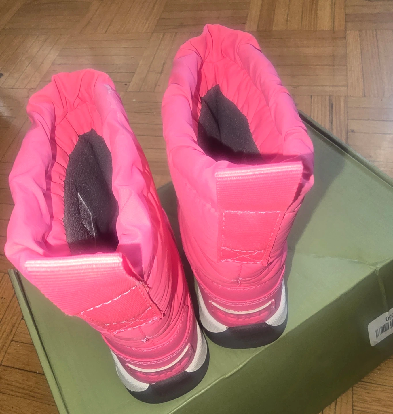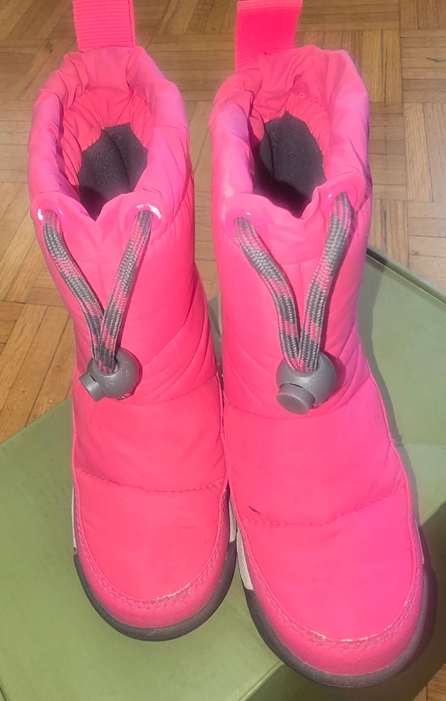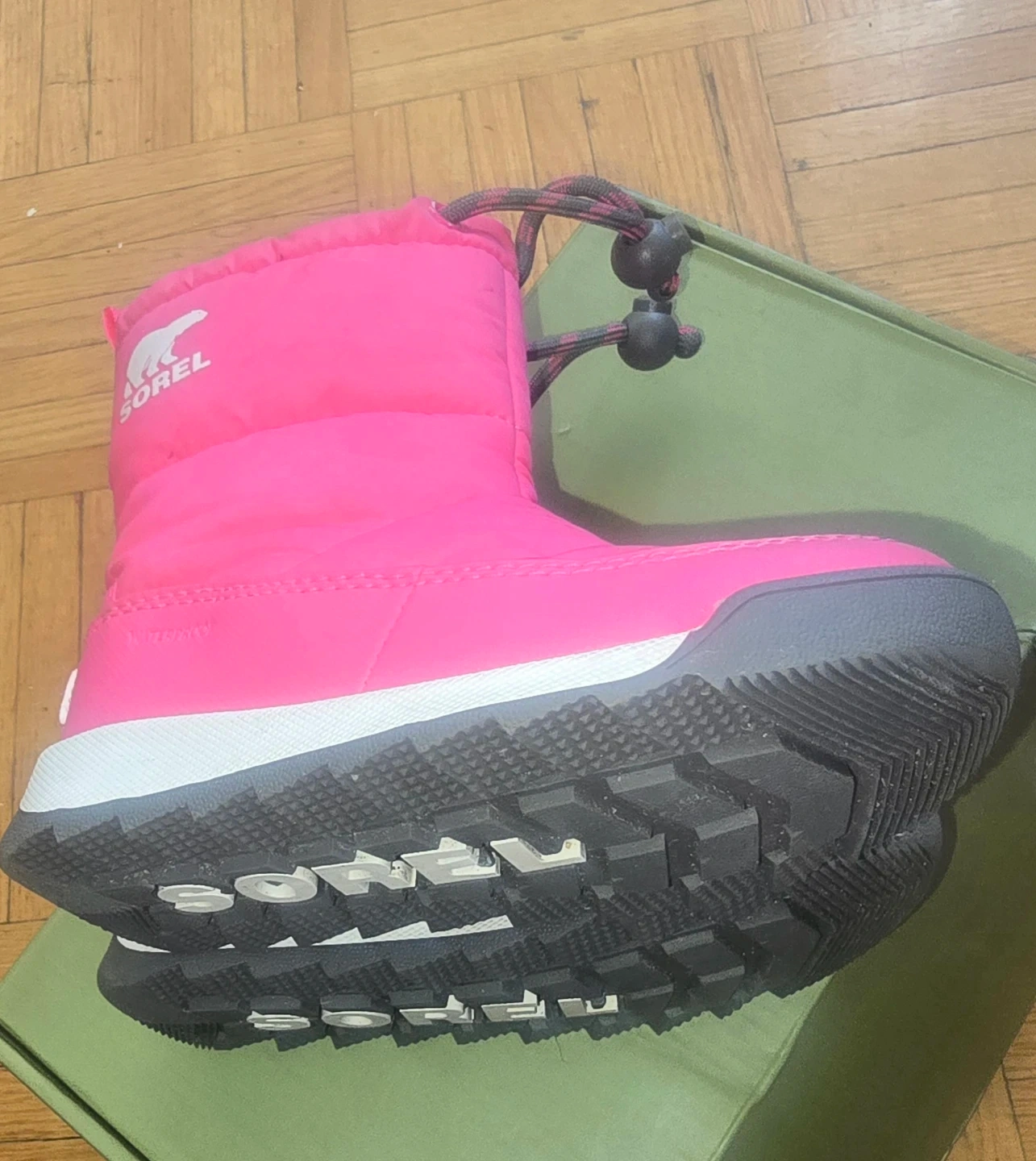 These Sorel winter boots are a bright pink puffer style. They feature a toggle drawstring for a snug fit. The boots have a durable rubber sole for traction.
