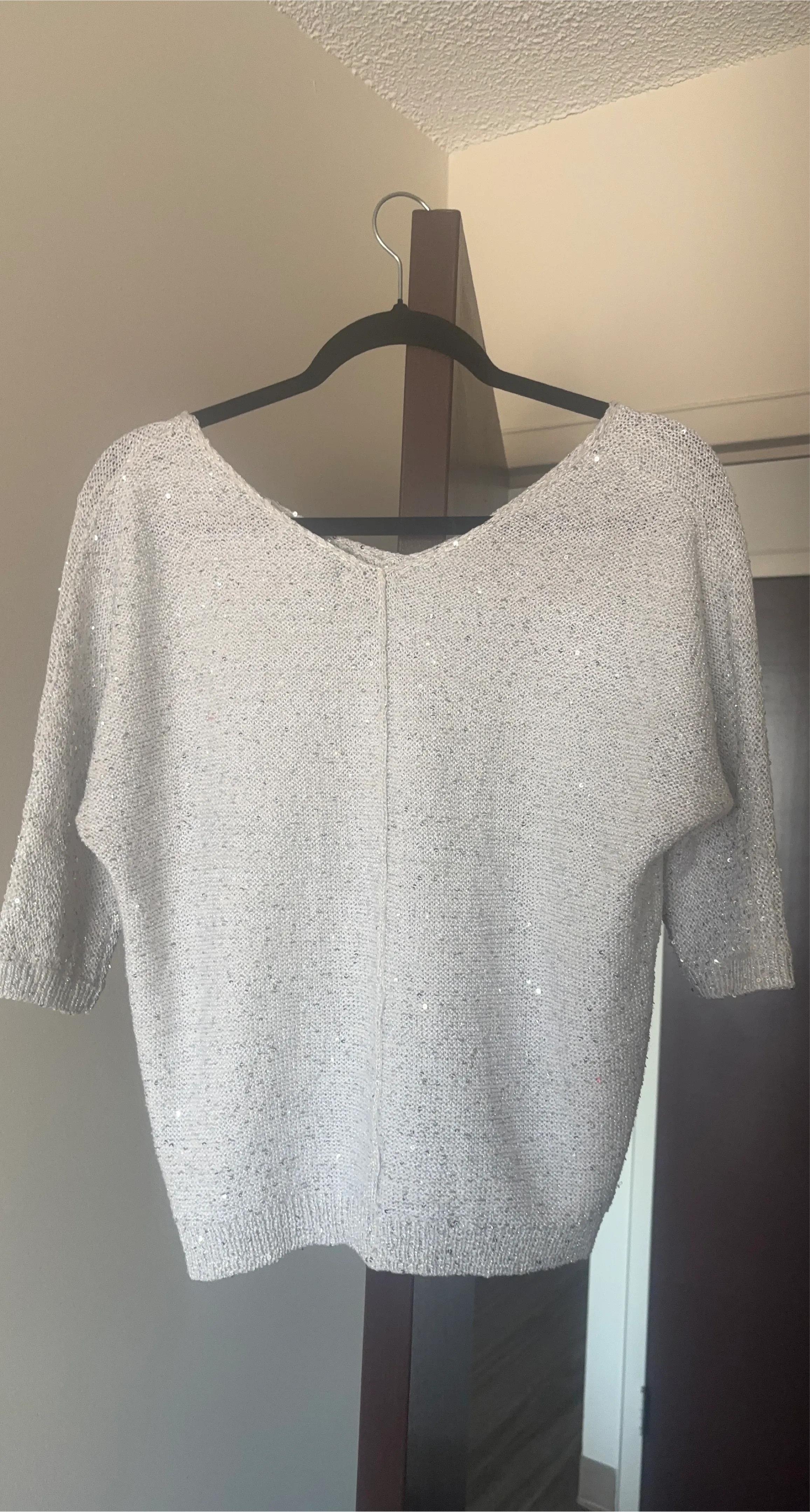 A sparkly silver knit top with short sleeves and a V-neckline. It's embellished with small sequins throughout the fabric for added shine. It's a stylish choice for dressing up an outfit!