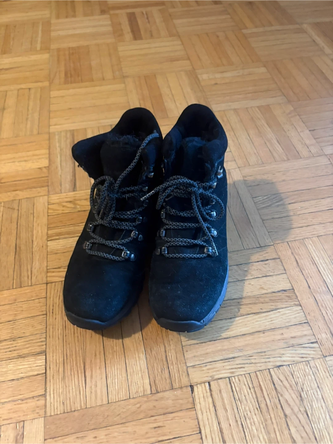 Black suede winter boots with faux fur lining and lace-up closure. These boots are perfect for cold weather. Great for keeping your feet warm and dry!