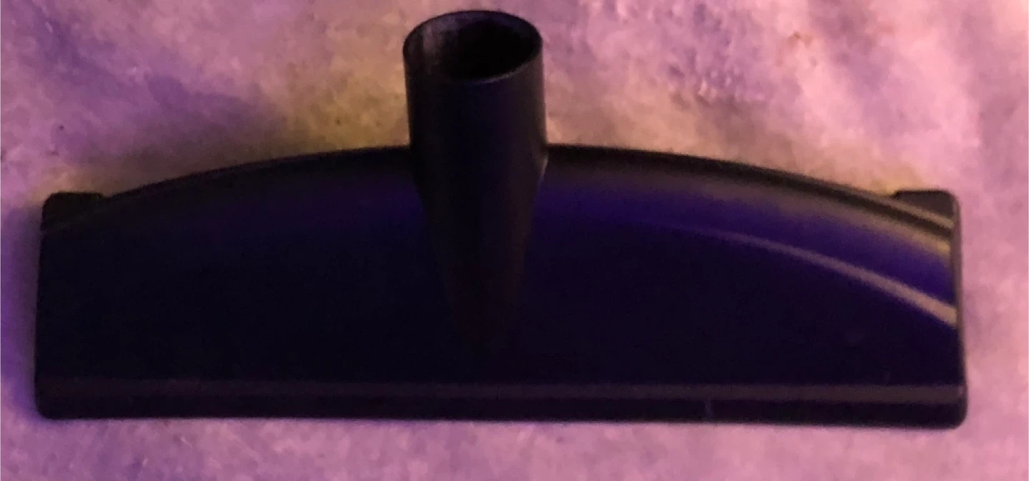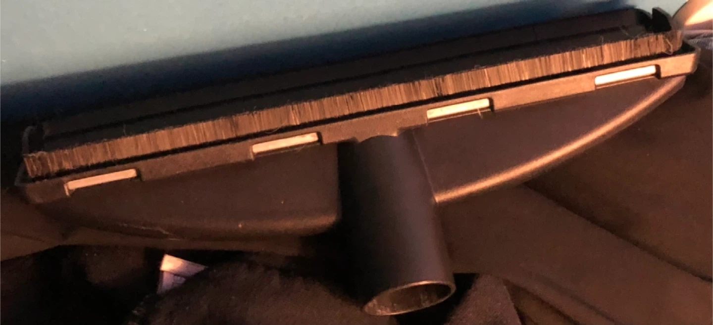 Black vacuum cleaner brush attachment. It has bristles for effective cleaning. Useful for reaching tight spots and cleaning upholstery.