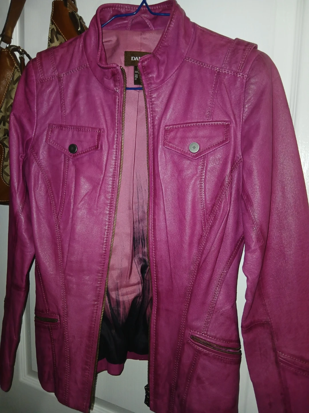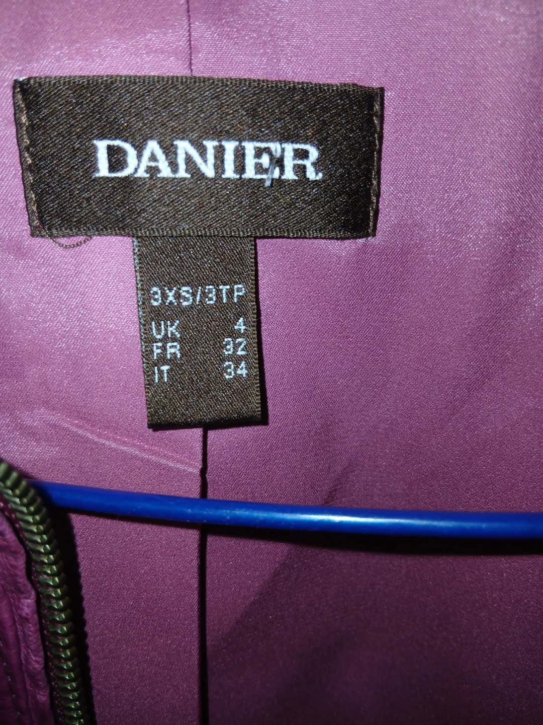 Here's a stylish Danier leather jacket in a lovely shade of purple! It's a size 3XS, perfect for petite frames. The jacket features a zippered front, pockets, and detailed stitching. It's in great condition and ready to add a pop of colour to your wardrobe