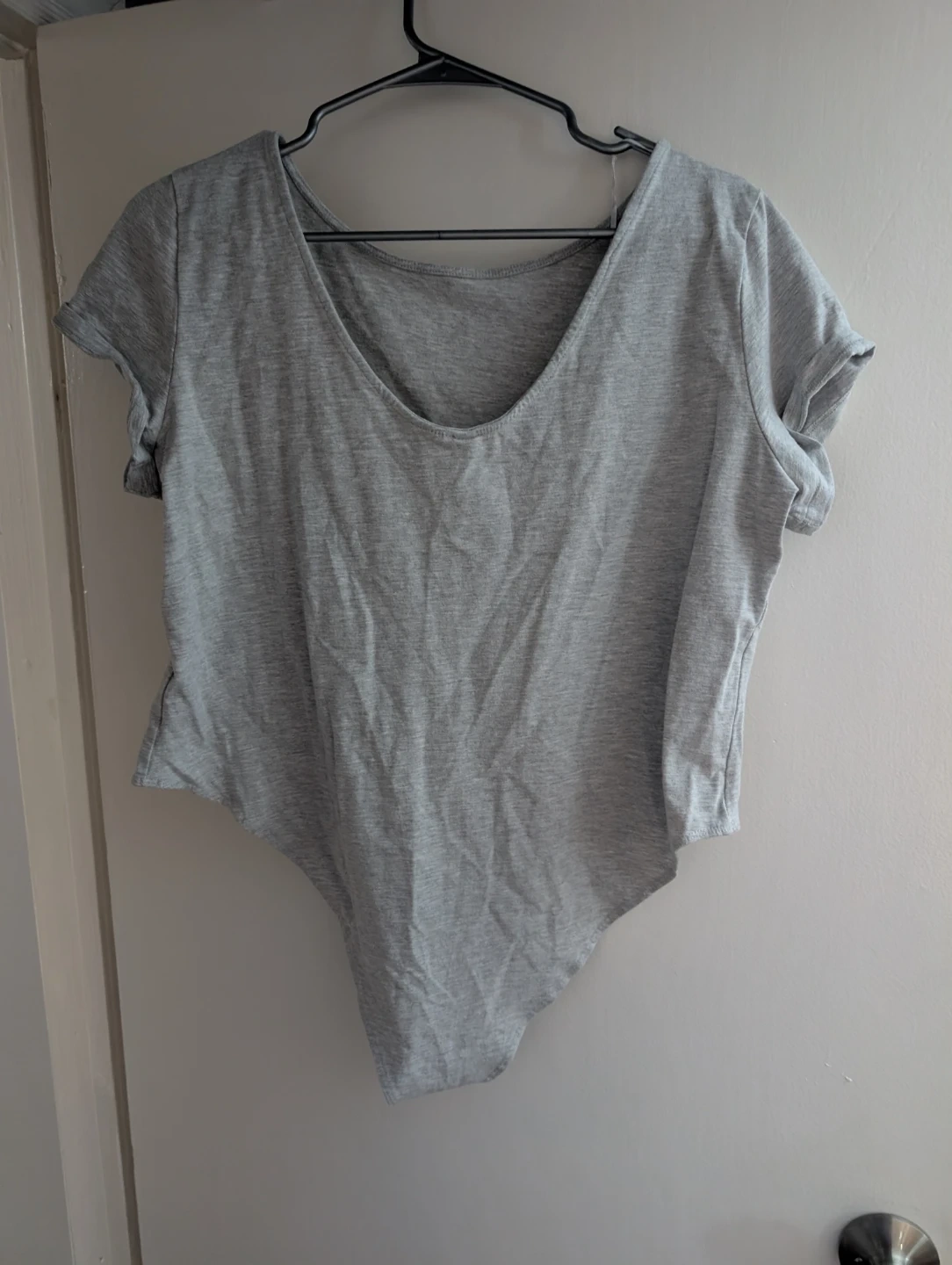 A comfy grey short sleeve bodysuit. It's made of a soft fabric blend. This bodysuit is great for layering or wearing on its own!