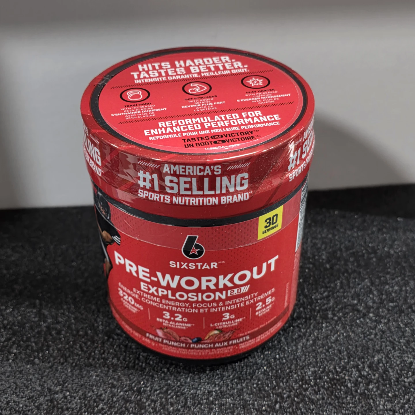Six Star Pre-Workout Explosion in Fruit Punch flavour. Comes with 30 servings. It's reformulated for enhanced performance. Contains 3.2g Beta-Alanine and 3g L-Citrulline.
