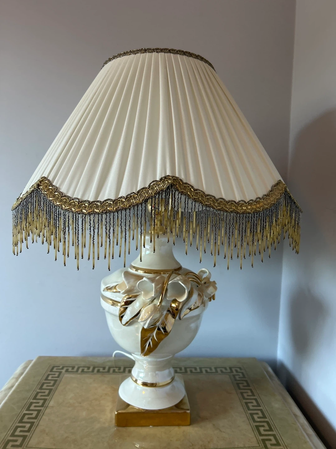 This is a beautiful vintage table lamp that would add an elegant touch to any room. It features a white base with gold floral accents and a pleated shade with beaded trim. It's in great condition and ready to brighten up your space