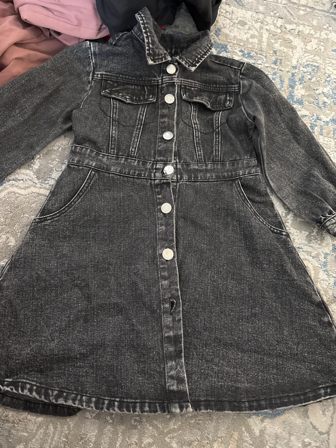A cute dark wash denim dress with a button-up front. It has a collared neckline and two chest pockets. Perfect for everyday wear!