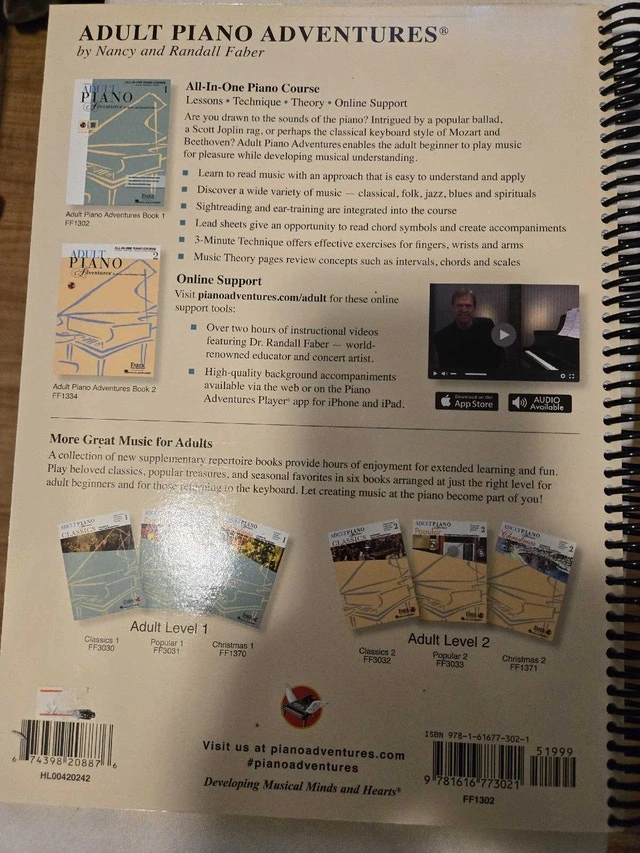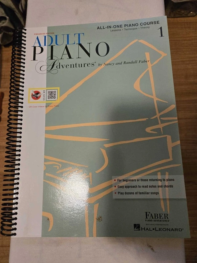 Dive into the world of music with this used Faber Adult Piano Adventures All-in-One Piano Course, Book 1! This book is designed for beginners or those returning to the piano, offering an easy approach to reading notes and chords and features dozens of familiar songs. Key Features: - All-in-One Piano Course: Lessons, Technique, Theory. - Designed for beginners and returning players. - Easy approach to reading notes and chords. - Includes dozens of familiar songs. This book has been used but is still in good condition, ready to help you on your musical journey. If the ad is up, it's available! Let the music begin!