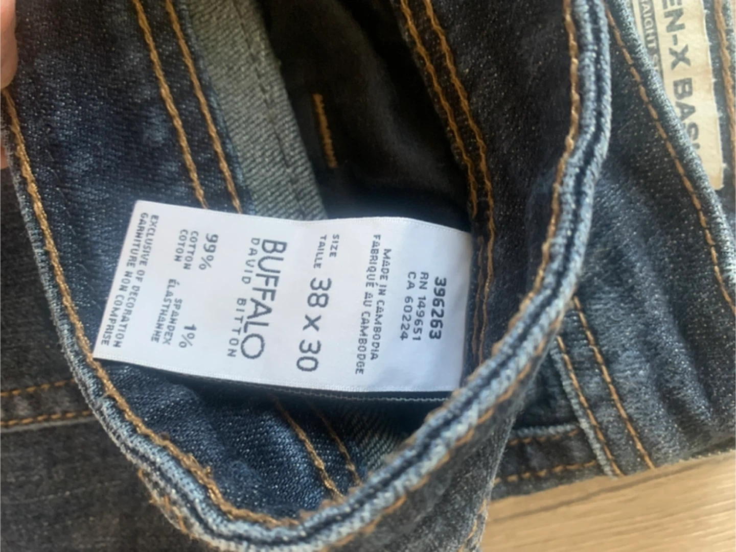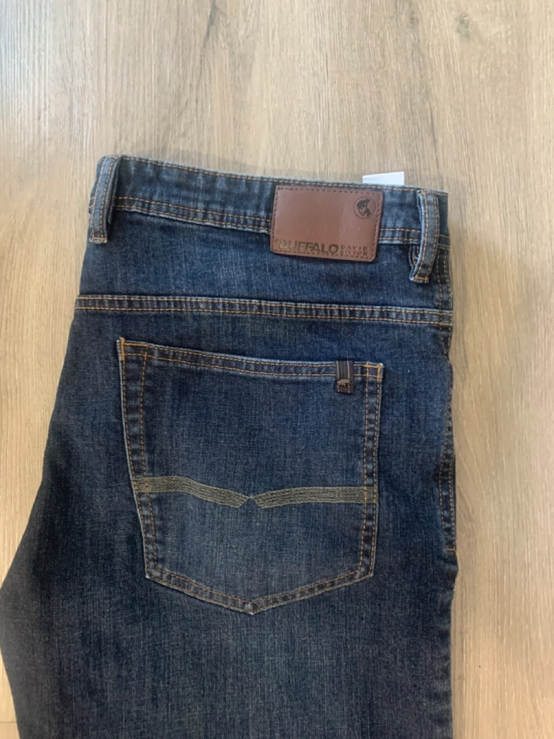These are Buffalo David Bitton men's jeans in a straight stretch fit. They're made with 99% cotton and 1% spandex. The waist is 38 inches and the inseam is 30 inches.