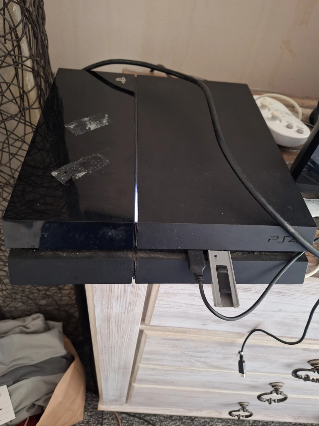 Black Sony PlayStation 4 console. Console has some dust on it and some tape residue on the top. It's a great console for gaming!