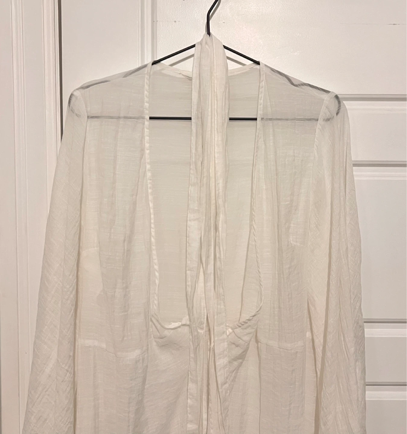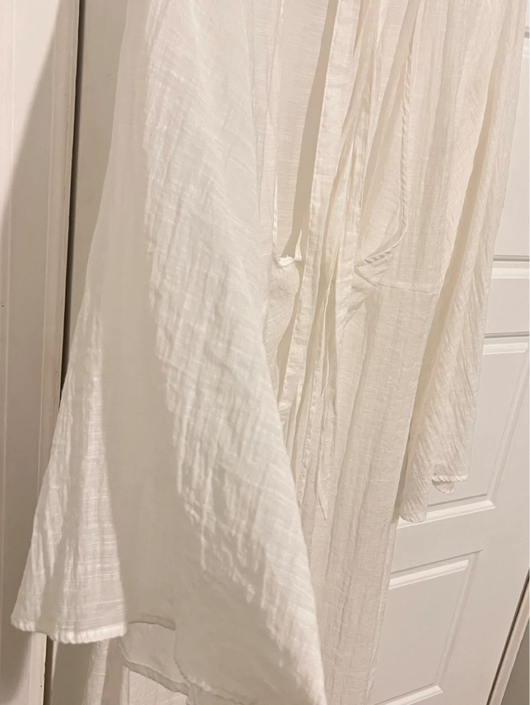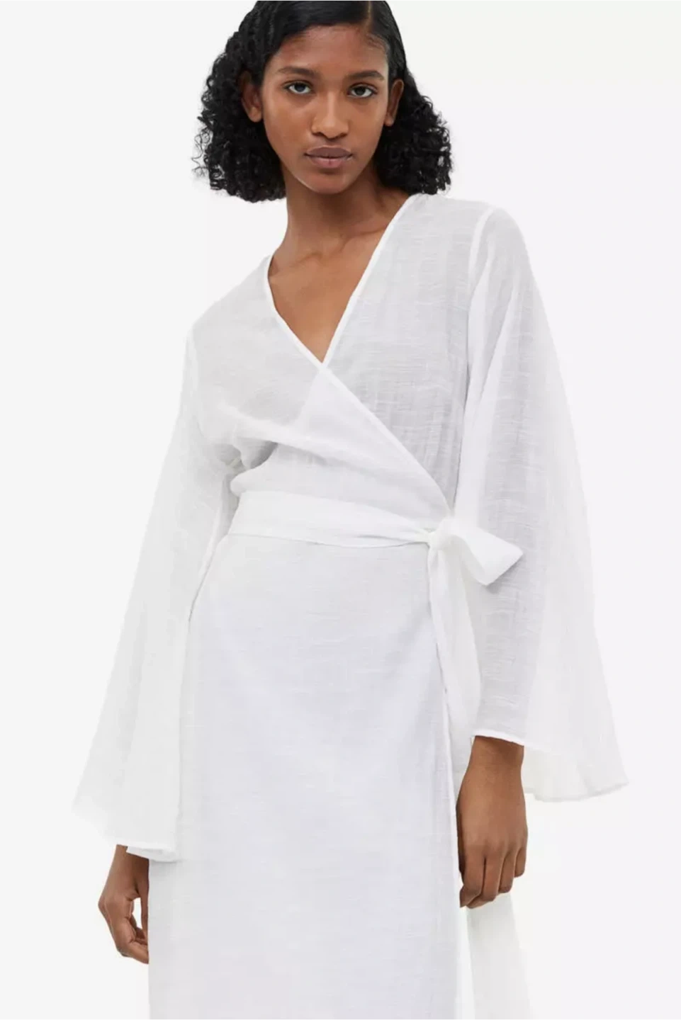 Ankle-length dress in a crêpe weave with a wrapover front that fastens with a tie belt at the waist. Long, flared sleeves. Unlined.