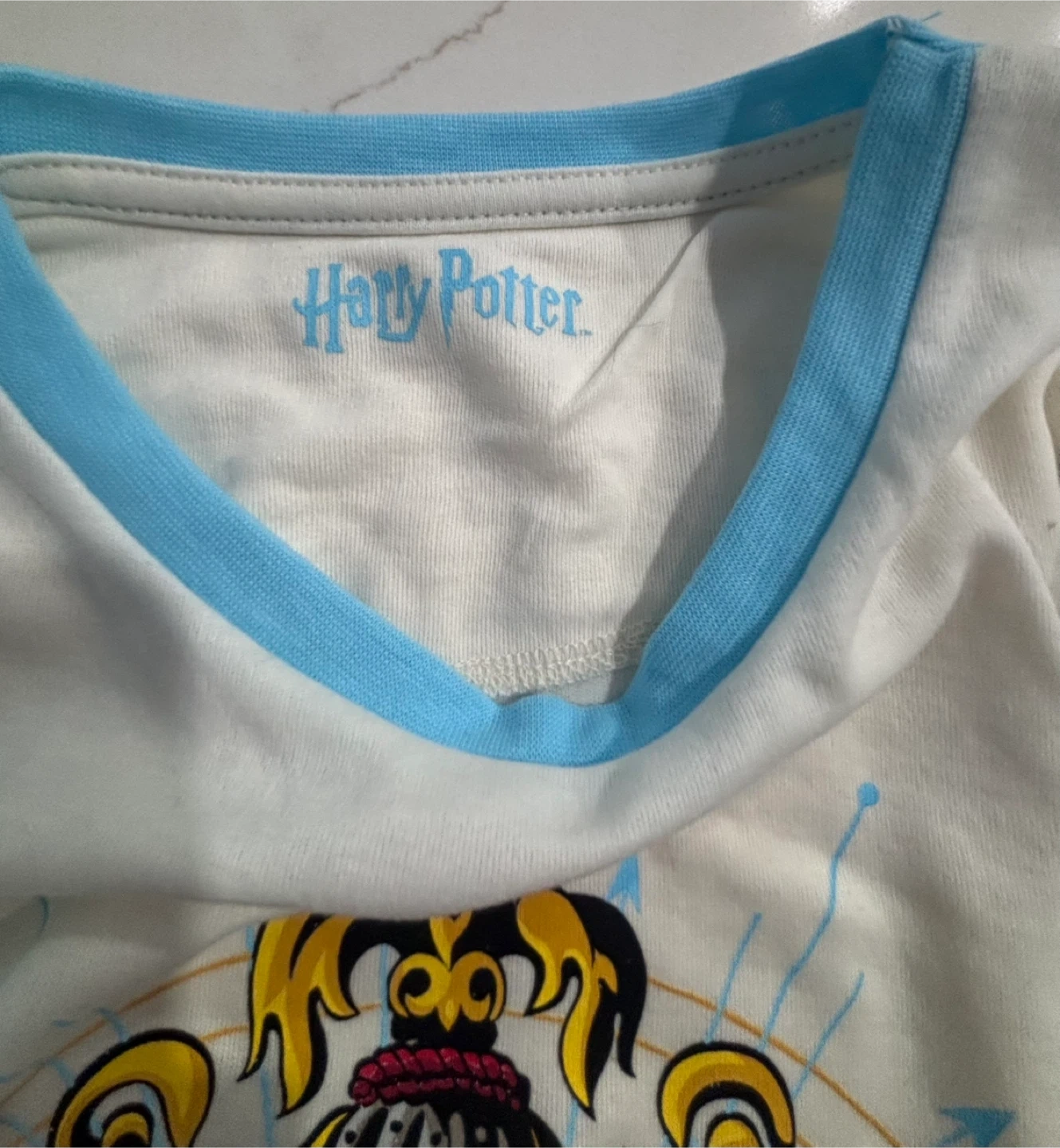 New White long-sleeved Harry Potter pyjamas with the Hogwarts crest. Includes a blue trim on the collar and cuffs.