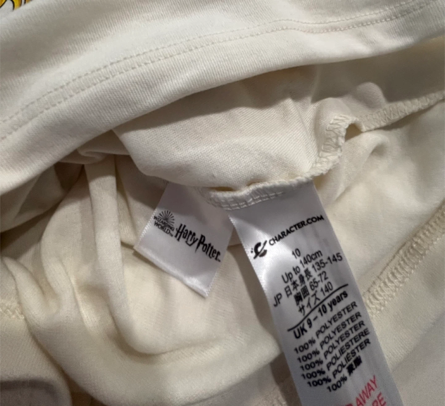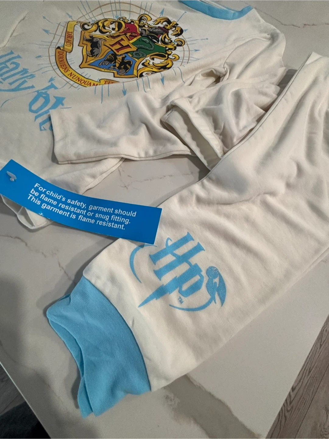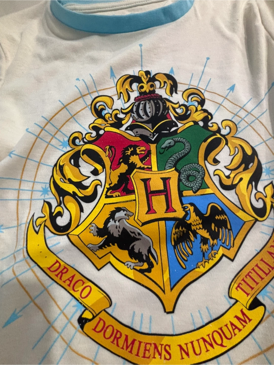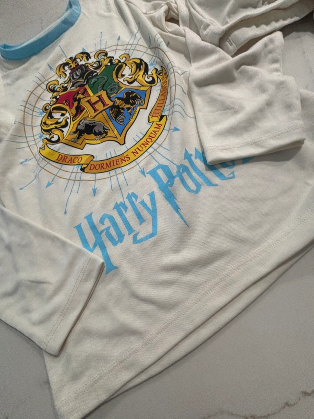 New White long-sleeved Harry Potter pyjamas with the Hogwarts crest. Includes a blue trim on the collar and cuffs.